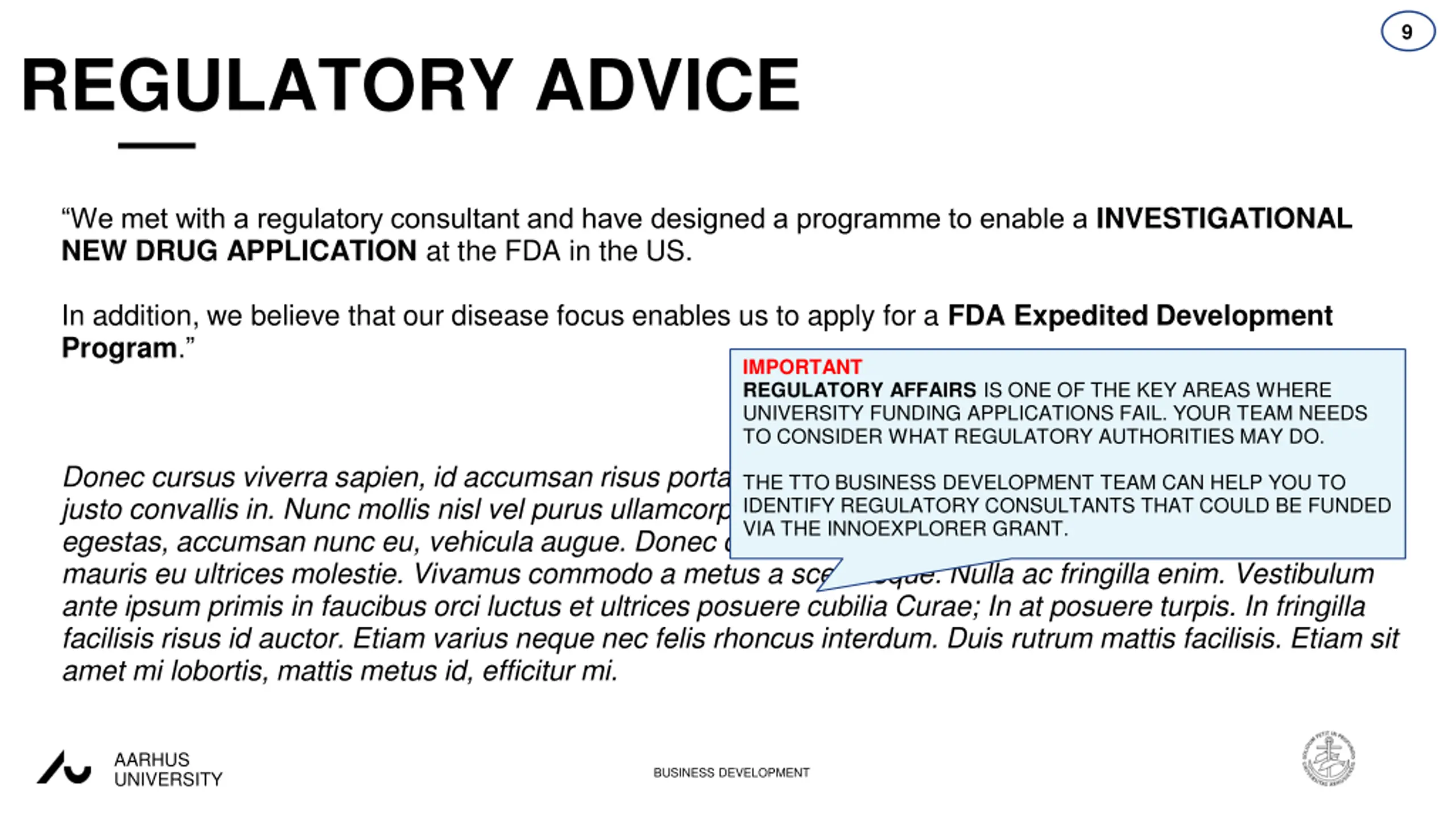 9 REGULATORY ADVICE We met with a regulatory consultant and have designed a programme to enable a INVESTIGATIONAL NEW DRUG APPLICATION at the FDA in the US. In addition, we believe that our disease focus enables us to apply for a FDA Expedited Development Program. IMPORTANT REGULATORY AFFAIRS IS ONE OF THE KEY AREAS WHERE UNIVERSITY FUNDING APPLICATIONS FAIL. YOUR TEAM NEEDS TO CONSIDER WHAT REGULATORY AUTHORITIES MAY DO. Donec cursus viverra sapien, id accumsan risus porta accumsan. Integer tempor malesuada nisl, ut gravida justo convallis in. Nunc mollis nisl vel purus ullamcorper, eu viverra est ullamcorper. Vivamus quis magna egestas, accumsan nunc eu, vehicula augue. Donec dapibus eros eu est pharetra euismod. Nam aliquet mauris eu ultrices molestie. Vivamus commodo a metus a scelerisque. Nulla ac fringilla enim. Vestibulum ante ipsum primis in faucibus orci luctus et ultrices posuere cubilia Curae; In at posuere turpis. In fringilla facilisis risus id auctor. Etiam varius neque nec felis rhoncus interdum. Duis rutrum mattis facilisis. Etiam sit amet mi lobortis, mattis metus id, efficitur mi. THE TTO BUSINESS DEVELOPMENT TEAM CAN HELP YOU TO IDENTIFY REGULATORY CONSULTANTS THAT COULD BE FUNDED VIA THE INNOEXPLORER GRANT. AARHUS UNIVERSITY BUSINESS DEVELOPMENT