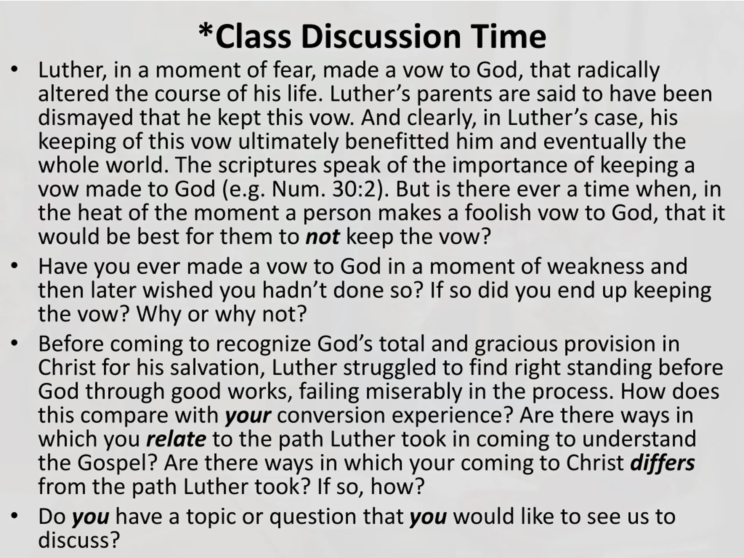 *Class Discussion Time Luther, in a moment of fear, made a vow to God, that radically altered the course of his life. Luther s parents are said to have been dismayed that he kept this vow. And clearly, in Luther s case, his keeping of this vow ultimately benefitted him and eventually the whole world. The scriptures speak of the importance of keeping a vow made to God (e.g. Num. 30:2). But is there ever a time when, in the heat of the moment a person makes a foolish vow to God, that it would be best for them to not keep the vow? Have you ever made a vow to God in a moment of weakness and then later wished you hadn t done so? If so did you end up keeping the vow? Why or why not? Before coming to recognize God s total and gracious provision in Christ for his salvation, Luther struggled to find right standing before God through good works, failing miserably in the process. How does this compare with your conversion experience? Are there ways in which you relate to the path Luther took in coming to understand the Gospel? Are there ways in which your coming to Christ differs from the path Luther took? If so, how? Do you have a topic or question that you would like to see us to discuss?