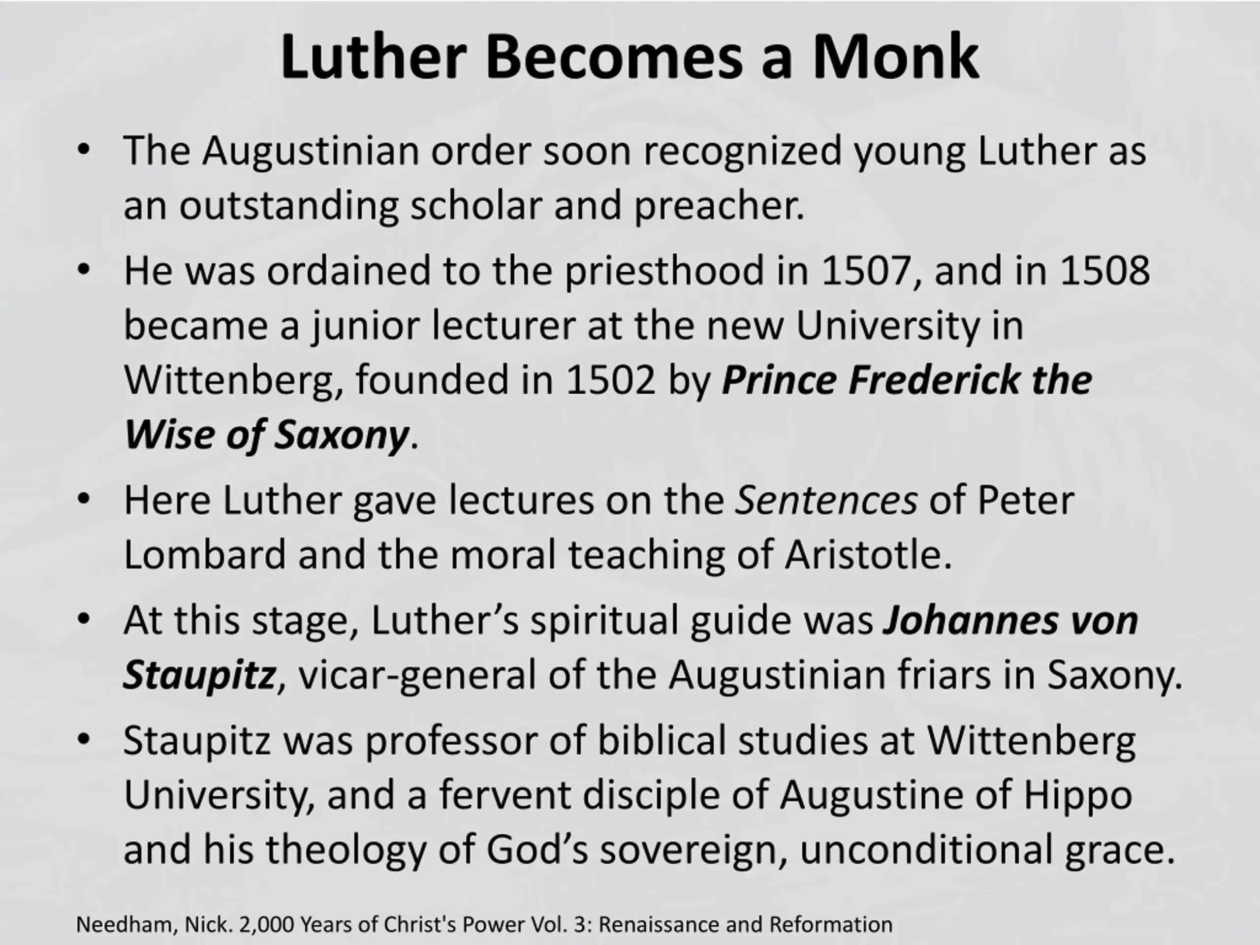 Luther Becomes a Monk The Augustinian order soon recognized young Luther as an outstanding scholar and preacher. He was ordained to the priesthood in 1507, and in 1508 became a junior lecturer at the new University in Wittenberg, founded in 1502 by Prince Frederick the Wise of Saxony. Here Luther gave lectures on the Sentences of Peter Lombard and the moral teaching of Aristotle. At this stage, Luther s spiritual guide was Johannes von Staupitz, vicar-general of the Augustinian friars in Saxony. Staupitz was professor of biblical studies at Wittenberg University, and a fervent disciple of Augustine of Hippo and his theology of God s sovereign, unconditional grace. Needham, Nick. 2,000 Years of Christ's Power Vol. 3: Renaissance and Reformation
