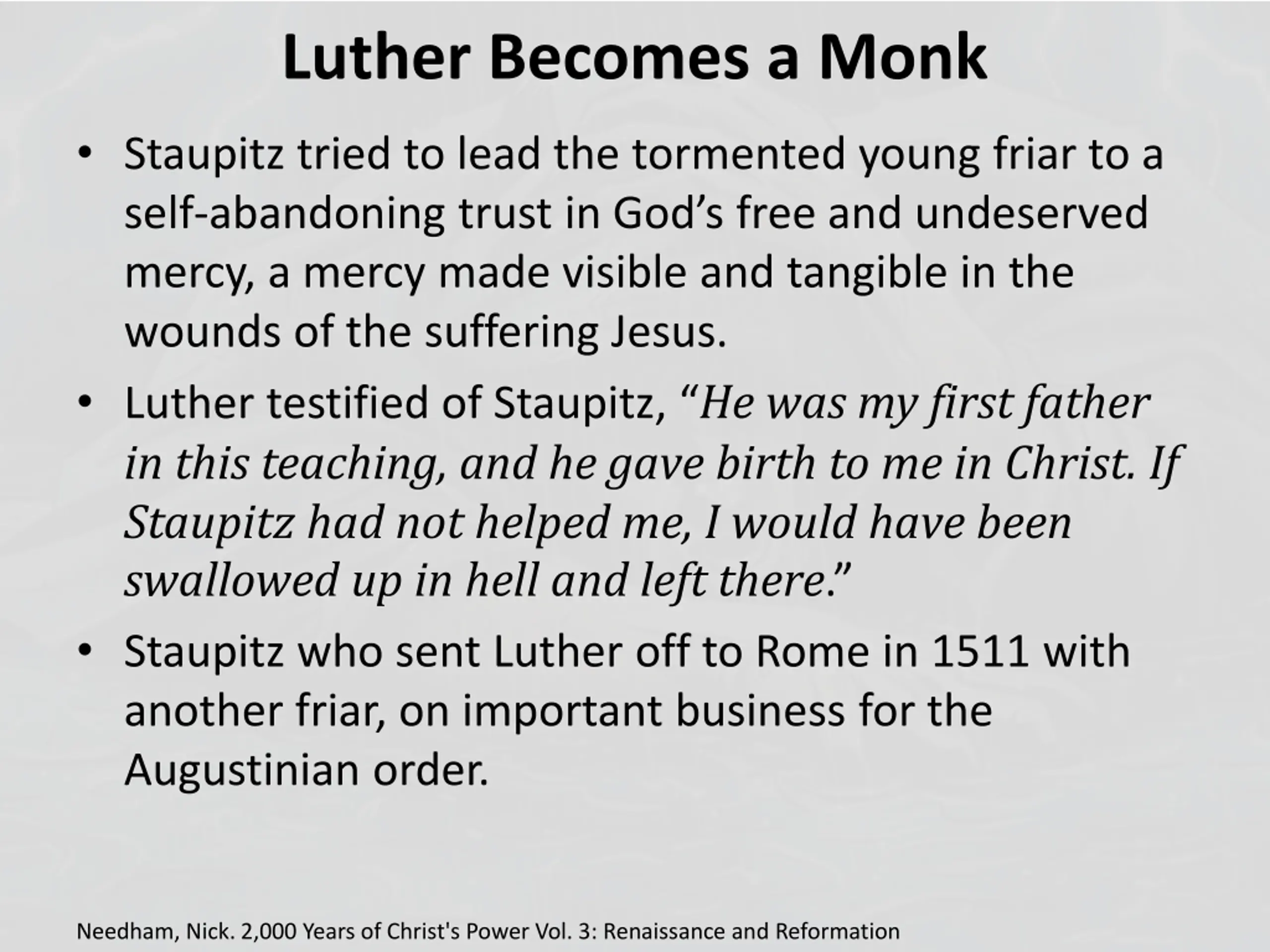 Luther Becomes a Monk Staupitz tried to lead the tormented young friar to a self-abandoning trust in God s free and undeserved mercy, a mercy made visible and tangible in the wounds of the suffering Jesus. Luther testified of Staupitz, He was my first father in this teaching, and he gave birth to me in Christ. If Staupitz had not helped me, I would have been swallowed up in hell and left there. Staupitz who sent Luther off to Rome in 1511 with another friar, on important business for the Augustinian order. Needham, Nick. 2,000 Years of Christ's Power Vol. 3: Renaissance and Reformation