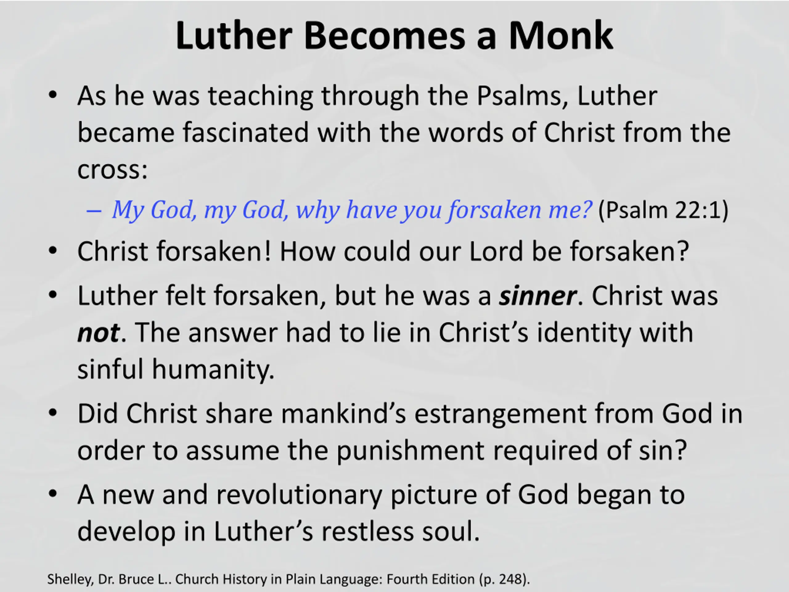 Luther Becomes a Monk As he was teaching through the Psalms, Luther became fascinated with the words of Christ from the cross: My God, my God, why have you forsaken me? (Psalm 22:1) Christ forsaken! How could our Lord be forsaken? Luther felt forsaken, but he was a sinner. Christ was not. The answer had to lie in Christ s identity with sinful humanity. Did Christ share mankind s estrangement from God in order to assume the punishment required of sin? A new and revolutionary picture of God began to develop in Luther s restless soul. Shelley, Dr. Bruce L.. Church History in Plain Language: Fourth Edition (p. 248).