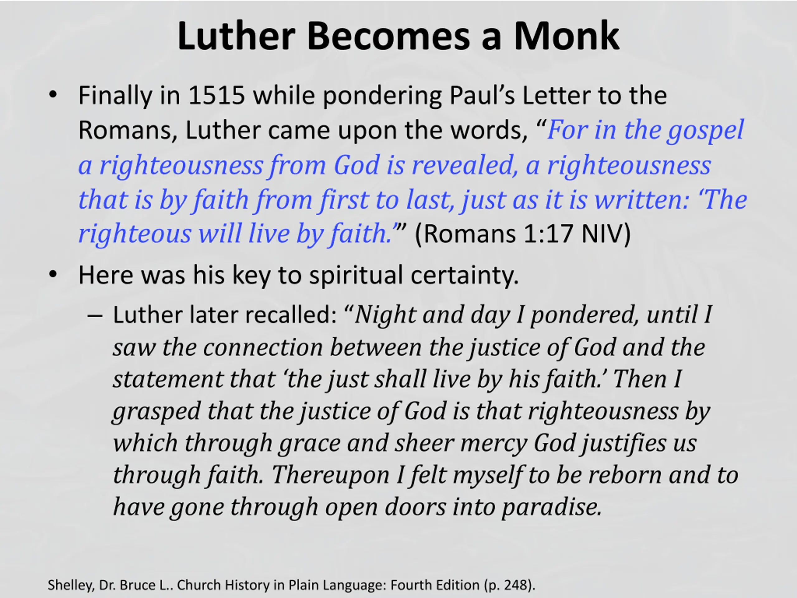 Luther Becomes a Monk Finally in 1515 while pondering Paul s Letter to the Romans, Luther came upon the words, For in the gospel a righteousness from God is revealed, a righteousness that is by faith from first to last, just as it is written: The righteous will live by faith. (Romans 1:17 NIV) Here was his key to spiritual certainty. Luther later recalled: Night and day I pondered, until I saw the connection between the justice of God and the statement that the just shall live by his faith. Then I grasped that the justice of God is that righteousness by which through grace and sheer mercy God justifies us through faith. Thereupon I felt myself to be reborn and to have gone through open doors into paradise. Shelley, Dr. Bruce L.. Church History in Plain Language: Fourth Edition (p. 248).