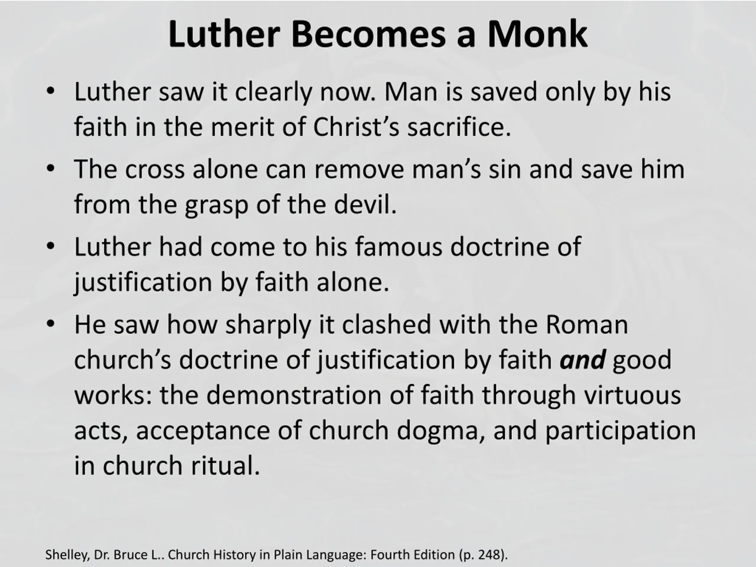 Luther Becomes a Monk Luther saw it clearly now. Man is saved only by his faith in the merit of Christ s sacrifice. The cross alone can remove man s sin and save him from the grasp of the devil. Luther had come to his famous doctrine of justification by faith alone. He saw how sharply it clashed with the Roman church s doctrine of justification by faith and good works: the demonstration of faith through virtuous acts, acceptance of church dogma, and participation in church ritual. Shelley, Dr. Bruce L.. Church History in Plain Language: Fourth Edition (p. 248).
