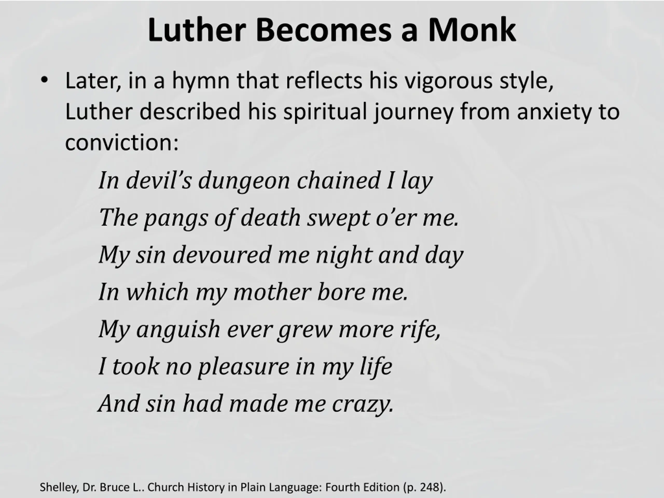 Luther Becomes a Monk Later, in a hymn that reflects his vigorous style, Luther described his spiritual journey from anxiety to conviction: In devil s dungeon chained I lay The pangs of death swept o er me. My sin devoured me night and day In which my mother bore me. My anguish ever grew more rife, I took no pleasure in my life And sin had made me crazy. Shelley, Dr. Bruce L.. Church History in Plain Language: Fourth Edition (p. 248).