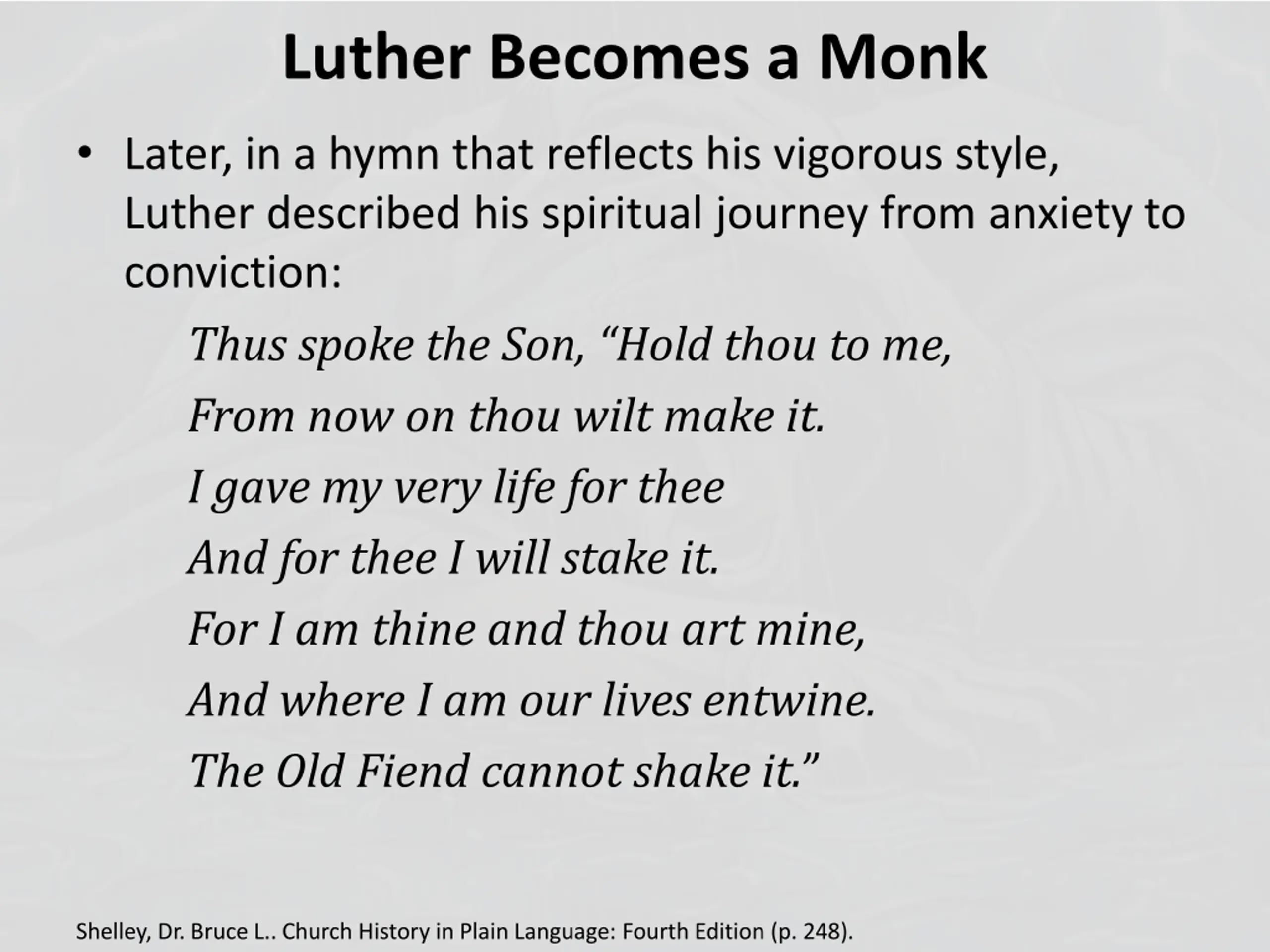 Luther Becomes a Monk Later, in a hymn that reflects his vigorous style, Luther described his spiritual journey from anxiety to conviction: Thus spoke the Son, Hold thou to me, From now on thou wilt make it. I gave my very life for thee And for thee I will stake it. For I am thine and thou art mine, And where I am our lives entwine. The Old Fiend cannot shake it. Shelley, Dr. Bruce L.. Church History in Plain Language: Fourth Edition (p. 248).
