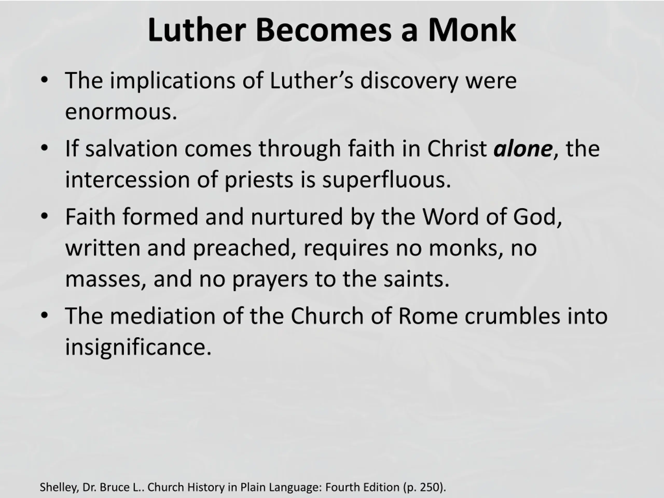 Luther Becomes a Monk The implications of Luther s discovery were enormous. If salvation comes through faith in Christ alone, the intercession of priests is superfluous. Faith formed and nurtured by the Word of God, written and preached, requires no monks, no masses, and no prayers to the saints. The mediation of the Church of Rome crumbles into insignificance. Shelley, Dr. Bruce L.. Church History in Plain Language: Fourth Edition (p. 250).
