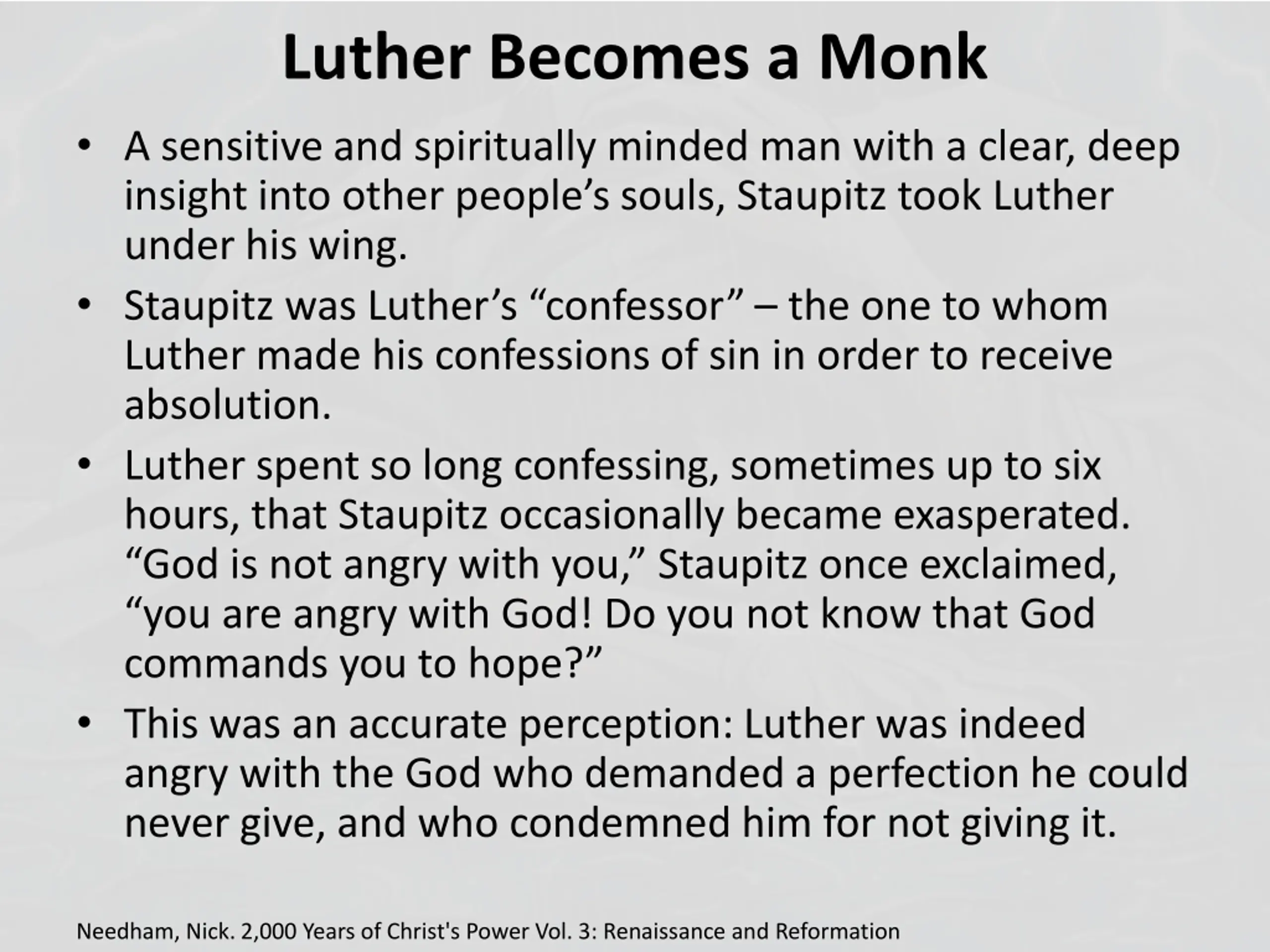 Luther Becomes a Monk A sensitive and spiritually minded man with a clear, deep insight into other people s souls, Staupitz took Luther under his wing. Staupitz was Luther s confessor the one to whom Luther made his confessions of sin in order to receive absolution. Luther spent so long confessing, sometimes up to six hours, that Staupitz occasionally became exasperated. God is not angry with you, Staupitz once exclaimed, you are angry with God! Do you not know that God commands you to hope? This was an accurate perception: Luther was indeed angry with the God who demanded a perfection he could never give, and who condemned him for not giving it. Needham, Nick. 2,000 Years of Christ's Power Vol. 3: Renaissance and Reformation
