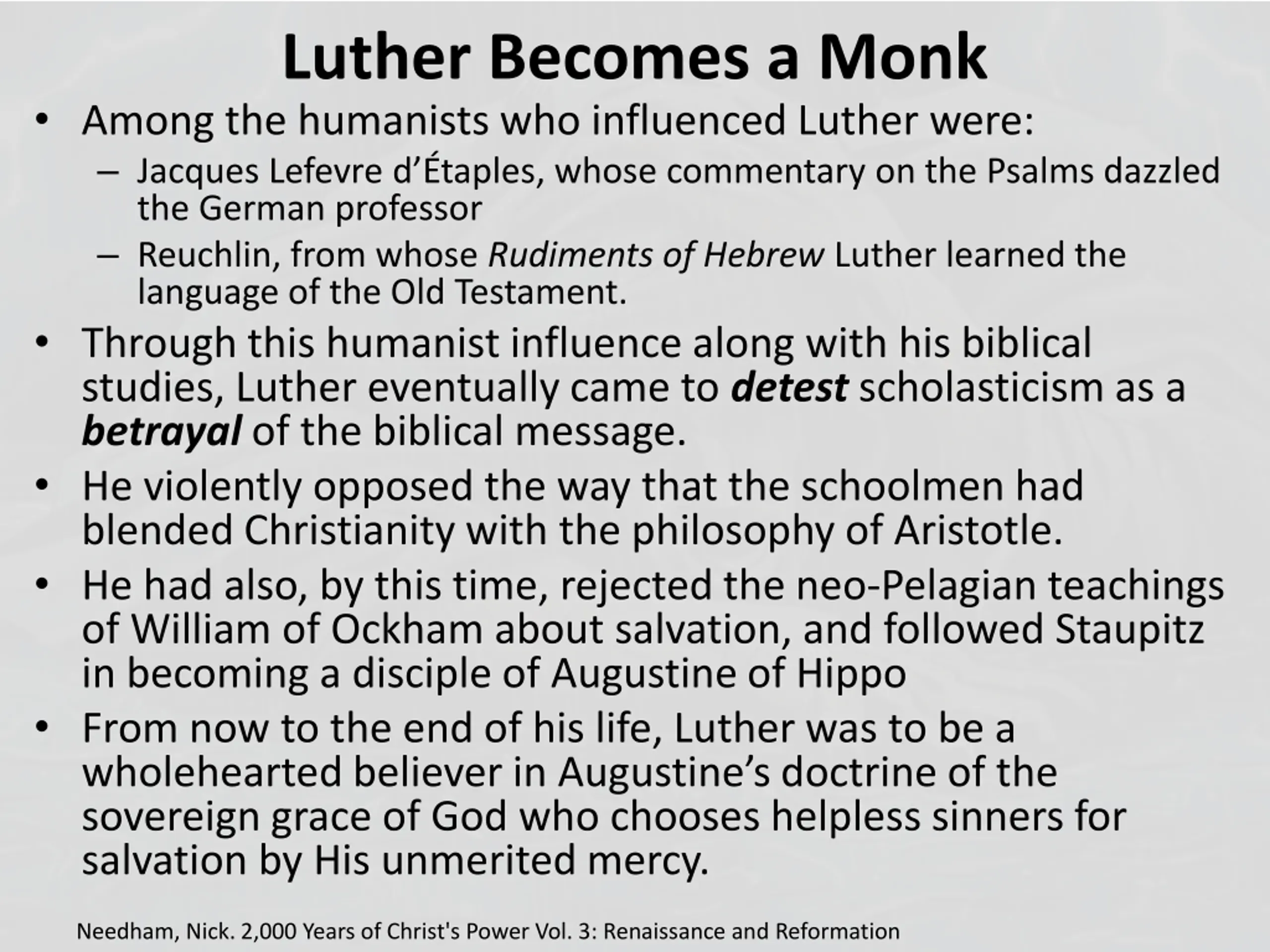 Luther Becomes a Monk Among the humanists who influenced Luther were: Jacques Lefevre d taples, whose commentary on the Psalms dazzled the German professor Reuchlin, from whose Rudiments of Hebrew Luther learned the language of the Old Testament. Through this humanist influence along with his biblical studies, Luther eventually came to detest scholasticism as a betrayal of the biblical message. He violently opposed the way that the schoolmen had blended Christianity with the philosophy of Aristotle. He had also, by this time, rejected the neo-Pelagian teachings of William of Ockham about salvation, and followed Staupitz in becoming a disciple of Augustine of Hippo From now to the end of his life, Luther was to be a wholehearted believer in Augustine s doctrine of the sovereign grace of God who chooses helpless sinners for salvation by His unmerited mercy. Needham, Nick. 2,000 Years of Christ's Power Vol. 3: Renaissance and Reformation