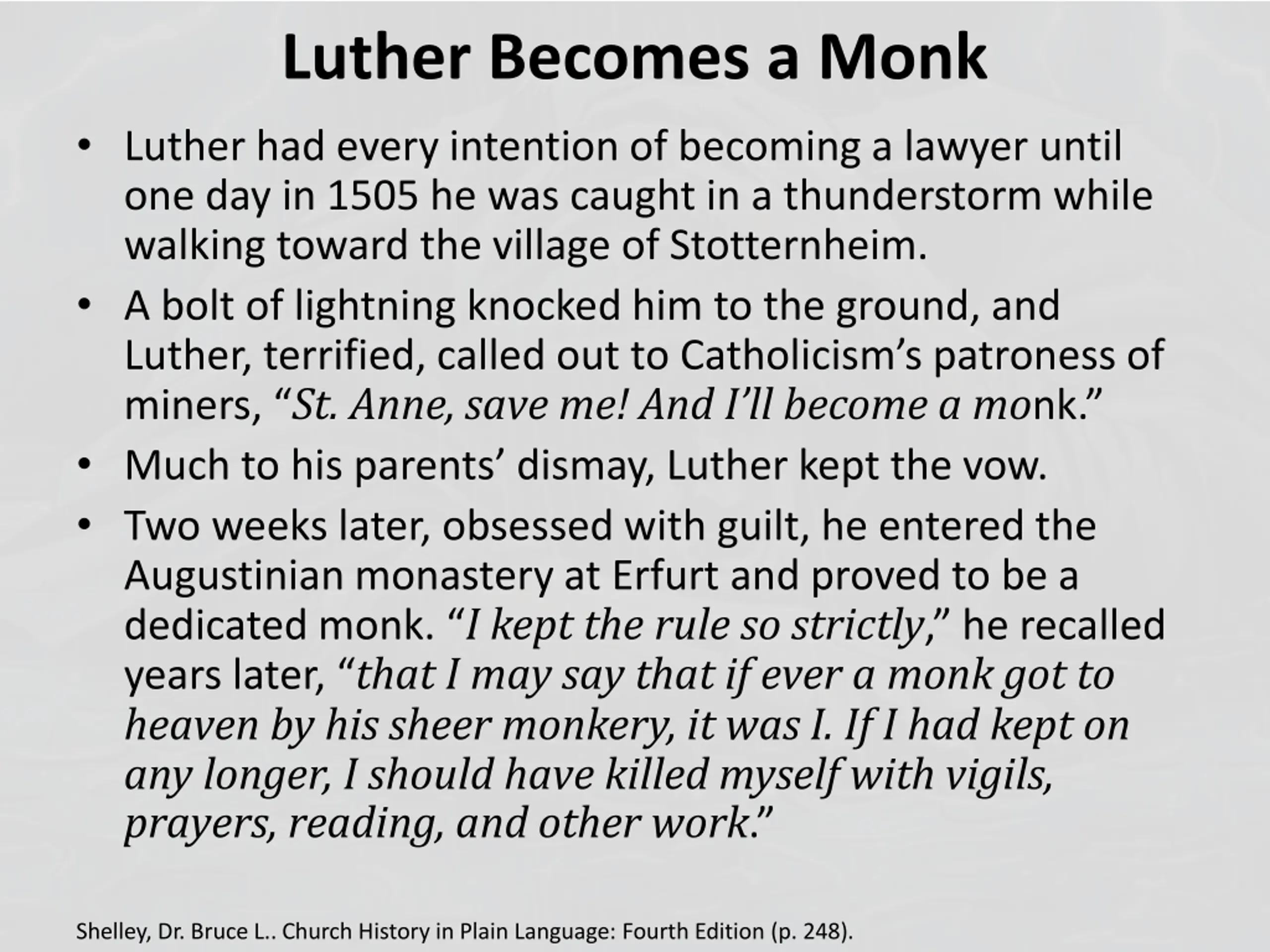 Luther Becomes a Monk Luther had every intention of becoming a lawyer until one day in 1505 he was caught in a thunderstorm while walking toward the village of Stotternheim. A bolt of lightning knocked him to the ground, and Luther, terrified, called out to Catholicism s patroness of miners, St. Anne, save me! And I ll become a monk. Much to his parents dismay, Luther kept the vow. Two weeks later, obsessed with guilt, he entered the Augustinian monastery at Erfurt and proved to be a dedicated monk. I kept the rule so strictly, he recalled years later, that I may say that if ever a monk got to heaven by his sheer monkery, it was I. If I had kept on any longer, I should have killed myself with vigils, prayers, reading, and other work. Shelley, Dr. Bruce L.. Church History in Plain Language: Fourth Edition (p. 248).