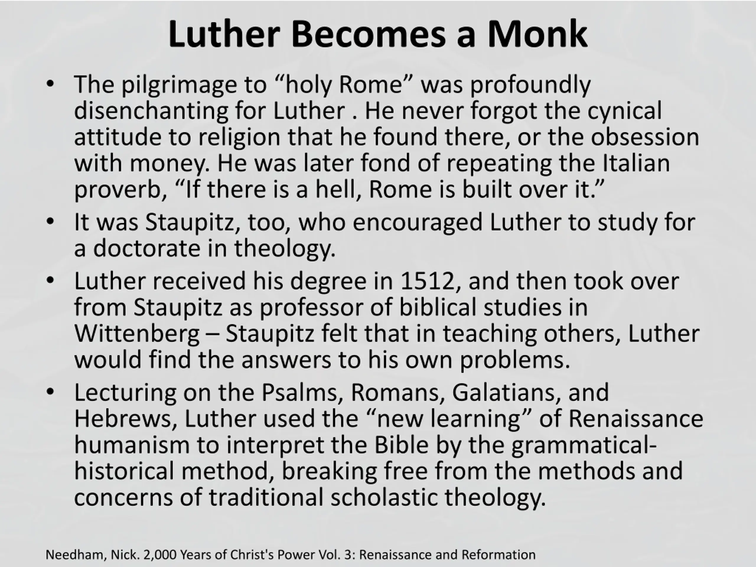 Luther Becomes a Monk The pilgrimage to holy Rome was profoundly disenchanting for Luther . He never forgot the cynical attitude to religion that he found there, or the obsession with money. He was later fond of repeating the Italian proverb, If there is a hell, Rome is built over it. It was Staupitz, too, who encouraged Luther to study for a doctorate in theology. Luther received his degree in 1512, and then took over from Staupitz as professor of biblical studies in Wittenberg Staupitz felt that in teaching others, Luther would find the answers to his own problems. Lecturing on the Psalms, Romans, Galatians, and Hebrews, Luther used the new learning of Renaissance humanism to interpret the Bible by the grammatical- historical method, breaking free from the methods and concerns of traditional scholastic theology. Needham, Nick. 2,000 Years of Christ's Power Vol. 3: Renaissance and Reformation