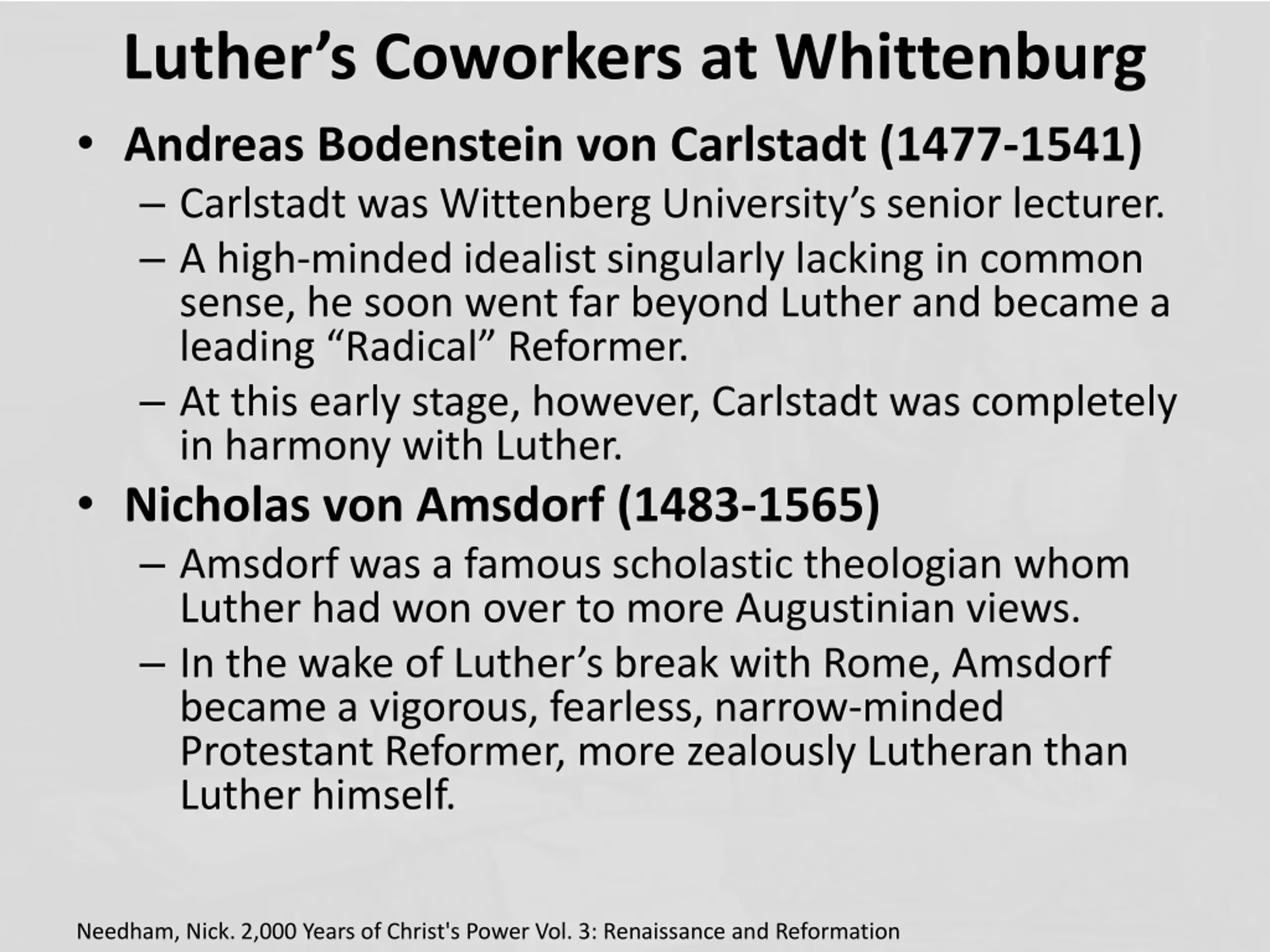 Luthers Coworkers at Whittenburg Andreas Bodenstein von Carlstadt (1477-1541) Carlstadt was Wittenberg University s senior lecturer. A high-minded idealist singularly lacking in common sense, he soon went far beyond Luther and became a leading Radical Reformer. At this early stage, however, Carlstadt was completely in harmony with Luther. Nicholas von Amsdorf (1483-1565) Amsdorf was a famous scholastic theologian whom Luther had won over to more Augustinian views. In the wake of Luther s break with Rome, Amsdorf became a vigorous, fearless, narrow-minded Protestant Reformer, more zealously Lutheran than Luther himself. Needham, Nick. 2,000 Years of Christ's Power Vol. 3: Renaissance and Reformation
