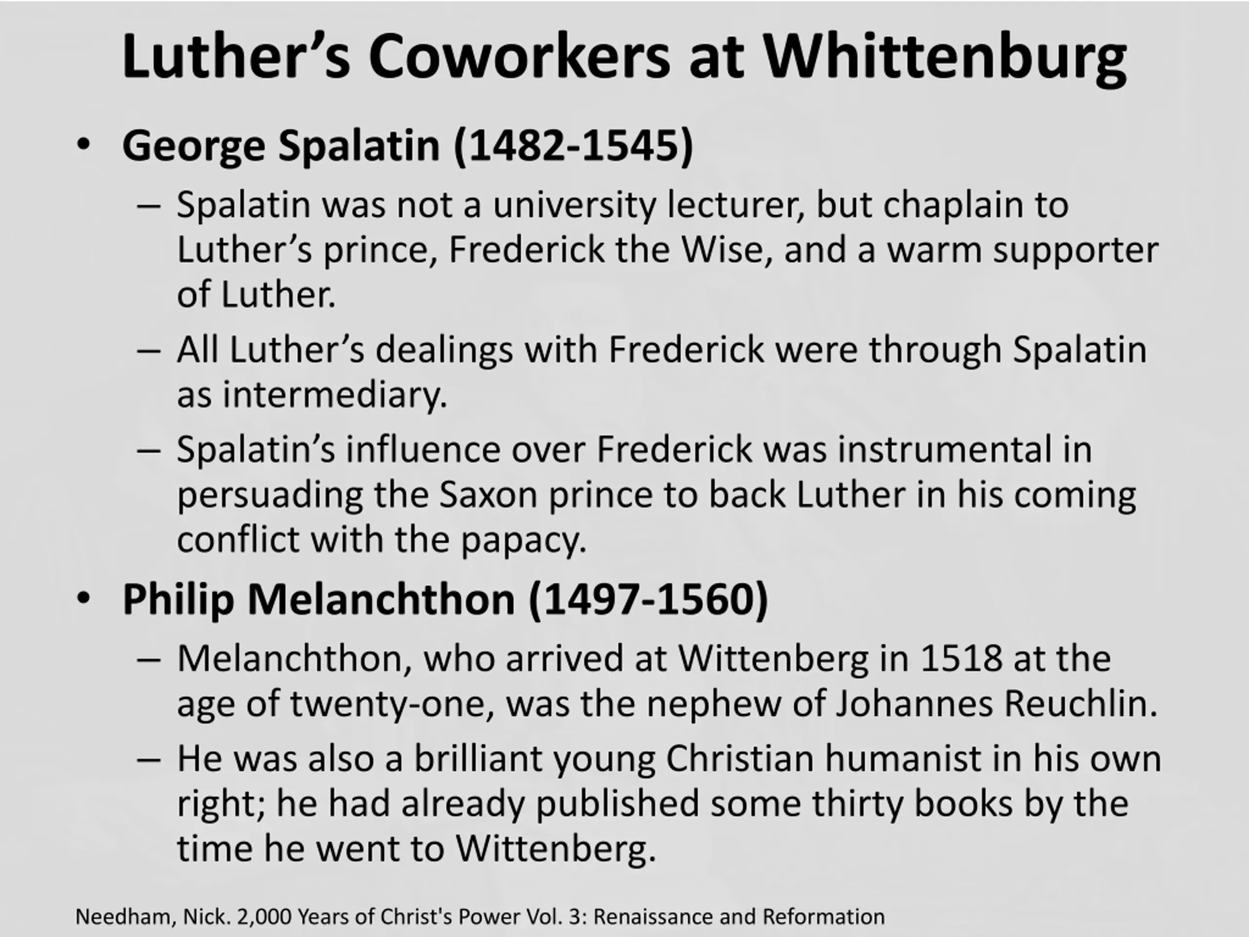 Luthers Coworkers at Whittenburg George Spalatin (1482-1545) Spalatin was not a university lecturer, but chaplain to Luther s prince, Frederick the Wise, and a warm supporter of Luther. All Luther s dealings with Frederick were through Spalatin as intermediary. Spalatin s influence over Frederick was instrumental in persuading the Saxon prince to back Luther in his coming conflict with the papacy. Philip Melanchthon (1497-1560) Melanchthon, who arrived at Wittenberg in 1518 at the age of twenty-one, was the nephew of Johannes Reuchlin. He was also a brilliant young Christian humanist in his own right; he had already published some thirty books by the time he went to Wittenberg. Needham, Nick. 2,000 Years of Christ's Power Vol. 3: Renaissance and Reformation