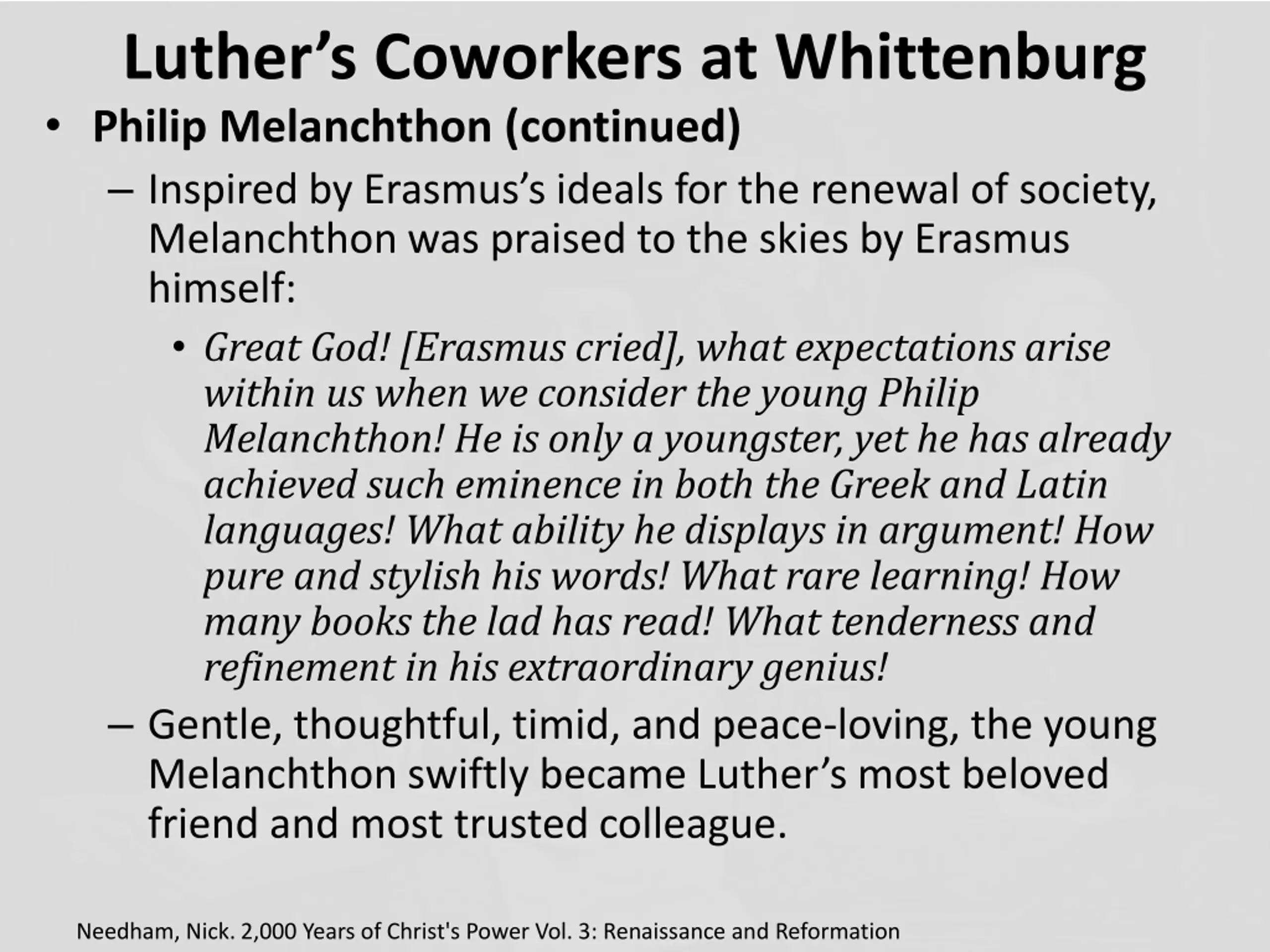 Luthers Coworkers at Whittenburg Philip Melanchthon (continued) Inspired by Erasmus s ideals for the renewal of society, Melanchthon was praised to the skies by Erasmus himself: Great God! [Erasmus cried], what expectations arise within us when we consider the young Philip Melanchthon! He is only a youngster, yet he has already achieved such eminence in both the Greek and Latin languages! What ability he displays in argument! How pure and stylish his words! What rare learning! How many books the lad has read! What tenderness and refinement in his extraordinary genius! Gentle, thoughtful, timid, and peace-loving, the young Melanchthon swiftly became Luther s most beloved friend and most trusted colleague. Needham, Nick. 2,000 Years of Christ's Power Vol. 3: Renaissance and Reformation