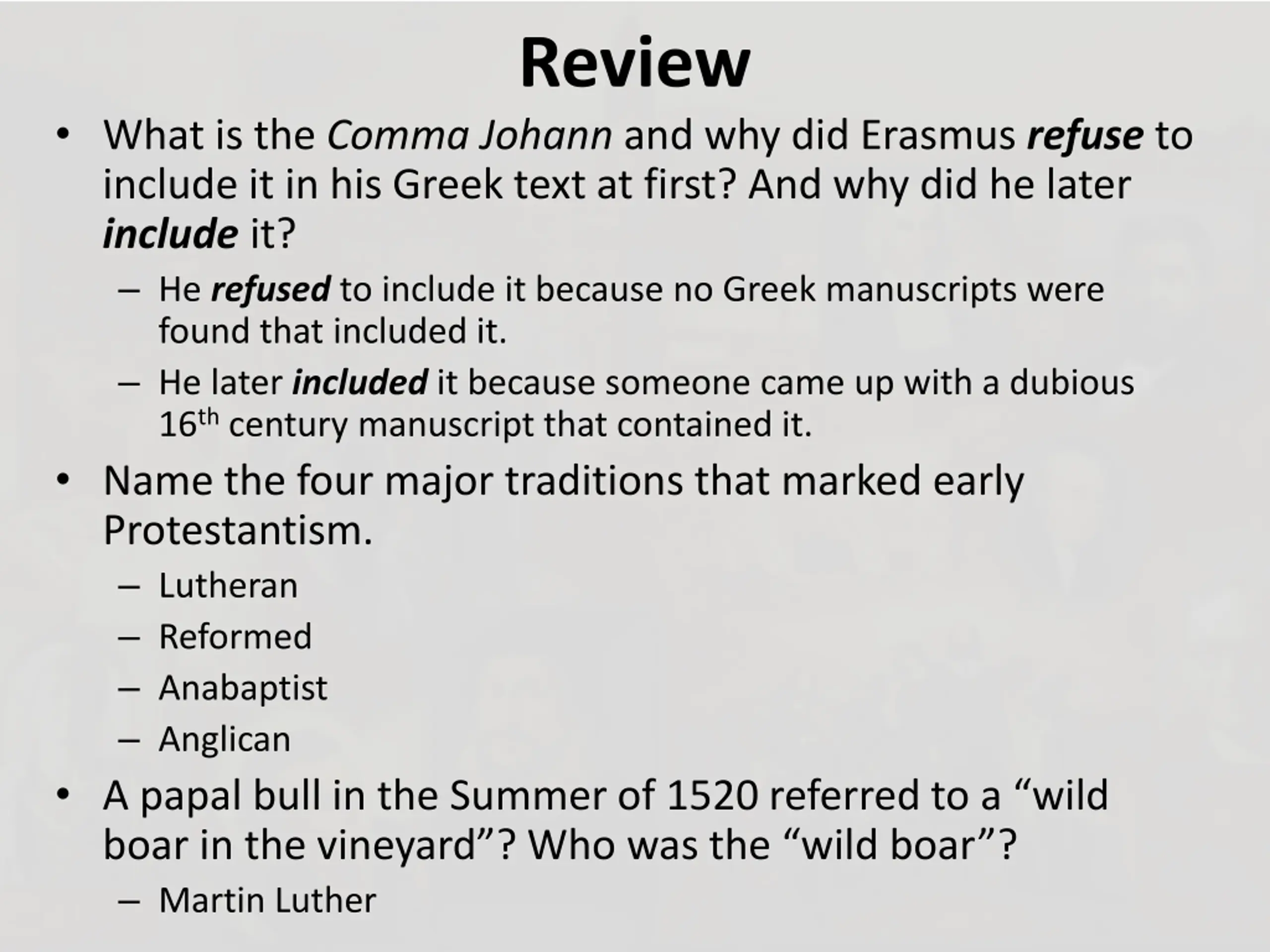 Review What is the Comma Johann and why did Erasmus refuse to include it in his Greek text at first? And why did he later include it? He refused to include it because no Greek manuscripts were found that included it. He later included it because someone came up with a dubious 16thcentury manuscript that contained it. Name the four major traditions that marked early Protestantism. Lutheran Reformed Anabaptist Anglican A papal bull in the Summer of 1520 referred to a wild boar in the vineyard ? Who was the wild boar ? Martin Luther