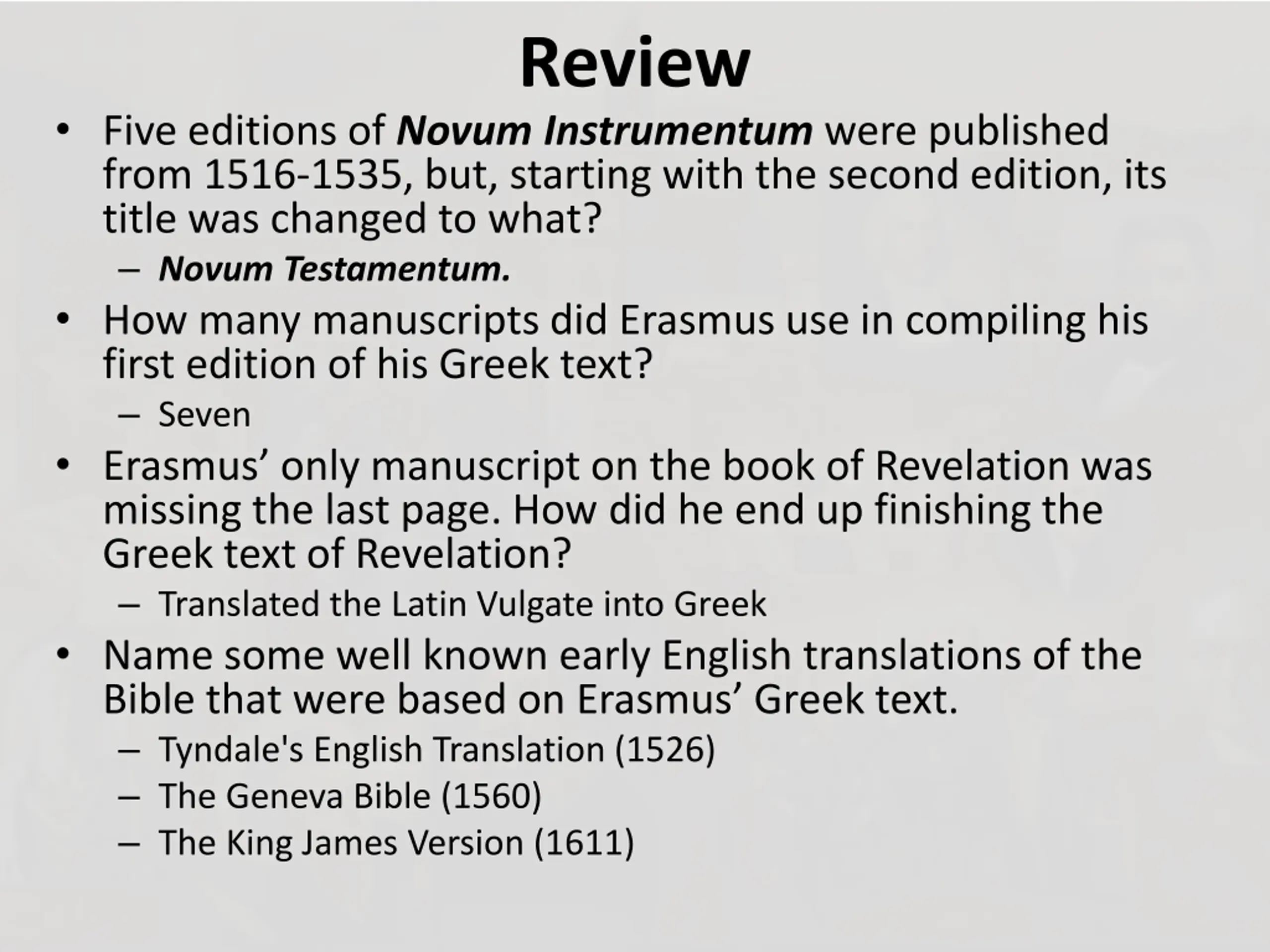 Review Five editions of Novum Instrumentum were published from 1516-1535, but, starting with the second edition, its title was changed to what? Novum Testamentum. How many manuscripts did Erasmus use in compiling his first edition of his Greek text? Seven Erasmus only manuscript on the book of Revelation was missing the last page. How did he end up finishing the Greek text of Revelation? Translated the Latin Vulgate into Greek Name some well known early English translations of the Bible that were based on Erasmus Greek text. Tyndale's English Translation (1526) The Geneva Bible (1560) The King James Version (1611)