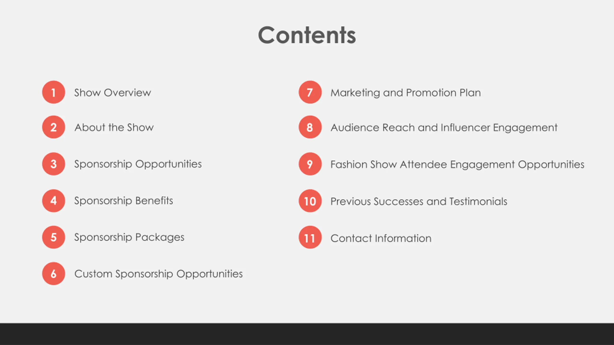 Contents 7 1 Marketing and Promotion Plan Show Overview 2 8 About the Show Audience Reach and Influencer Engagement 3 9 Sponsorship Opportunities Fashion Show Attendee Engagement Opportunities 4 Sponsorship Benefits 10 Previous Successes and Testimonials 5 Sponsorship Packages 11 Contact Information 6 Custom Sponsorship Opportunities