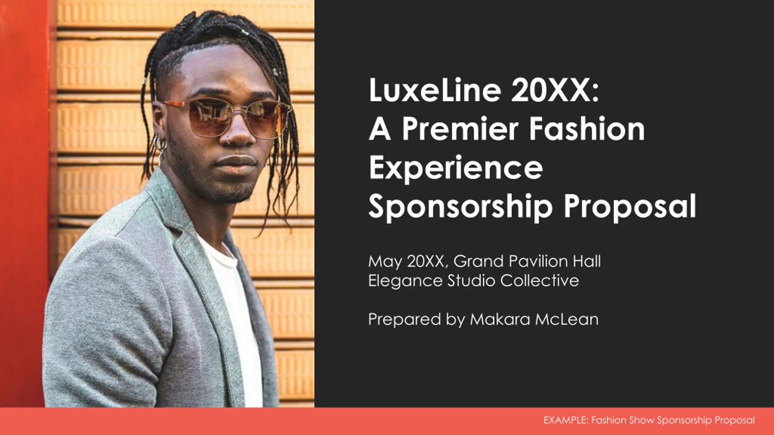 LuxeLine 20XX: A Premier Fashion Experience Sponsorship Proposal May 20XX, Grand Pavilion Hall Elegance Studio Collective Prepared by Makara McLean EXAMPLE: Fashion Show Sponsorship Proposal