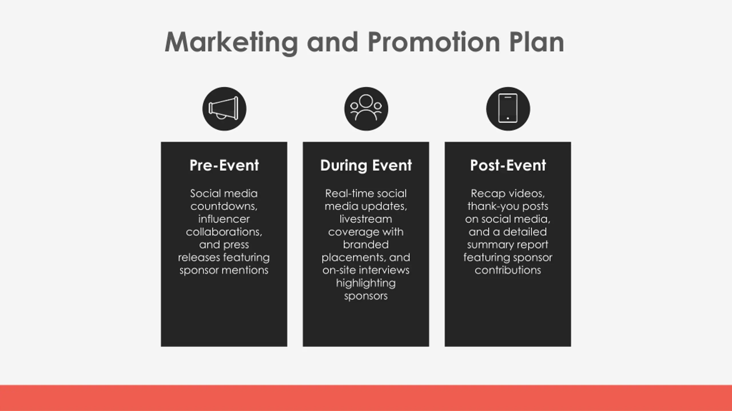 Marketing and Promotion Plan Pre-Event During Event Post-Event Social media countdowns, influencer collaborations, and press releases featuring sponsor mentions Real-time social media updates, livestream coverage with branded placements, and on-site interviews highlighting sponsors Recap videos, thank-you posts on social media, and a detailed summary report featuring sponsor contributions 7