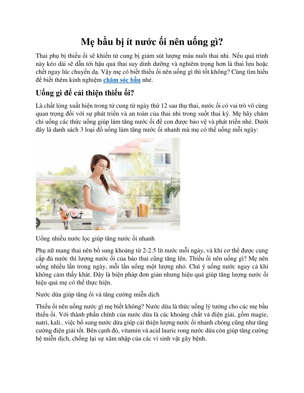 M bu bt nc i nn ung g? Thai ph b thi u i s khi n t cung b gi m s t l ng m u nu i thai nhi. N u qu tr nh n y k o d i s d n t i h u qu thai suy dinh d ng v nghi m tr ng h n l thai l u ho c ch t ngay l c chuy n d . V y m c bi t thi u i n n u ng g th t t kh ng? C ng t m hi u bi t th m kinh nghi m ch m s c b u nh . U ng g c i thi n thi u i? L ch t l ng xu t hi n trong t cung t ng y th 12 sau th thai, n c i c vai tr v c ng quan tr ng i v i s ph t tri n v an to n c a thai nhi trong su t thai k . M h y ch m ch u ng c c th c u ng gi p l m t ng n c i con c b o v v ph t tri n nh . D i y l danh s ch 3 lo i u ng l m t ng n c i nhanh m m c th u ng m i ng y: U ng nhi u n c l c gi p t ng n c i nhanh Ph n mang thai n n b sung kho ng t 2-2.5 l t n c m i ng y, v khi c th c cung c p n c th l ng n c i c a b o thai c ng t ng l n. Thi u i n n u ng g ? M n n u ng nhi u l n trong ng y, m i l n u ng m t l ng nh . Ch u ng n c ngay c khi kh ng c m th y kh t. y l bi n ph p n gi n nh ng hi u qu gi p t ng l ng n c i hi u qu m c th th c hi n. N c d a gi p t ng i v t ng c ng mi n d ch Thi u i n n u ng n c g m bi t kh ng? N c d a l th c u ng l t ng cho c c m b u thi u i. V i th nh ph n ch nh c a n c d a l c c kho ng ch t v i n gi i, g m magie, natri, kali.. vi c b sung n c d a gi p c i thi n l ng n c i nhanh ch ng c ng nh t ng c ng i n gi i t t. B n c nh , vitamin v acid lauric rong n c d a c n gi p t ng c ng h mi n d ch, ch ng l i s x m nh p c a c c vi sinh v t g y b nh.