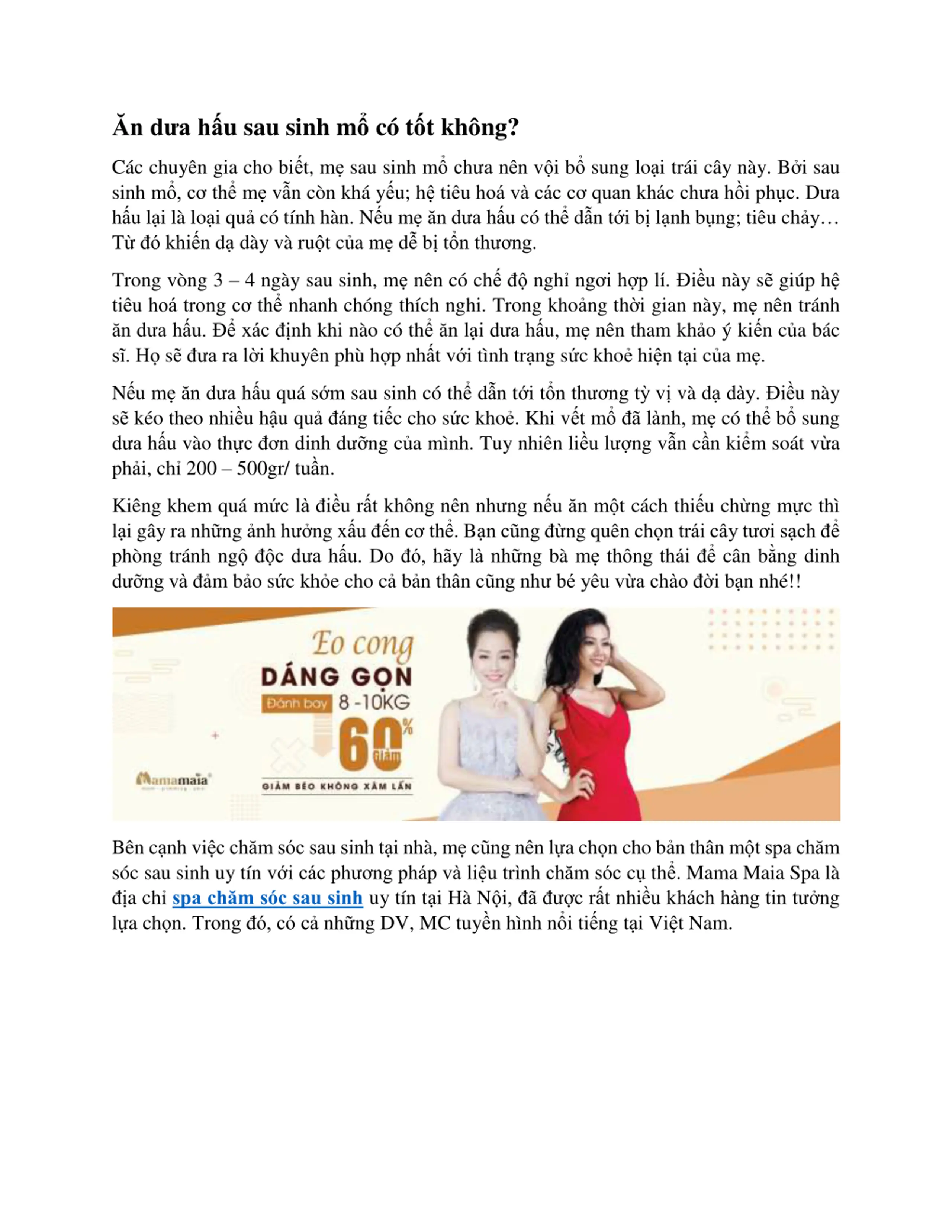 n da hu sau sinh m c tt khng? C c chuy n gia cho bi t, m sau sinh m ch a n n v i b sung lo i tr i c y n y. B i sau sinh m , c th m v n c n kh y u; h ti u ho v c c c quan kh c ch a h i ph c. D a h u l i l lo i qu c t nh h n. N u m n d a h u c th d n t i b l nh b ng; ti u ch y T khi n d d y v ru t c a m d b t n th ng. Trong v ng 3 4 ng y sau sinh, m n n c ch ngh ng i h p l . i u n y s gi p h ti u ho trong c th nhanh ch ng th ch nghi. Trong kho ng th i gian n y, m n n tr nh n d a h u. x c nh khi n o c th n l i d a h u, m n n tham kh o ki n c a b c s . H s a ra l i khuy n ph h p nh t v i t nh tr ng s c kho hi n t i c a m . N u m n d a h u qu s m sau sinh c th d n t i t n th ng t v v d d y. i u n y s k o theo nhi u h u qu ng ti c cho s c kho . Khi v t m l nh, m c th b sung d a h u v o th c n dinh d ng c a m nh. Tuy nhi n li u l ng v n c n ki m so t v a ph i, ch 200 500gr/ tu n. Ki ng khem qu m c l i u r t kh ng n n nh ng n u n m t c ch thi u ch ng m c th l i g y ra nh ng nh h ng x u n c th . B n c ng ng qu n ch n tr i c y t i s ch ph ng tr nh ng c d a h u. Do , h y l nh ng b m th ng th i c n b ng dinh d ng v m b o s c kh e cho c b n th n c ng nh b y u v a ch o i b n nh !! B n c nh vi c ch m s c sau sinh t i nh , m c ng n n l a ch n cho b n th n m t spa ch m s c sau sinh uy t n v i c c ph ng ph p v li u tr nh ch m s c c th . Mama Maia Spa l a ch spa ch m s c sau sinh uy t n t i H N i, c r t nhi u kh ch h ng tin t ng l a ch n. Trong , c c nh ng DV, MC tuy n h nh n i ti ng t i Vi t Nam.