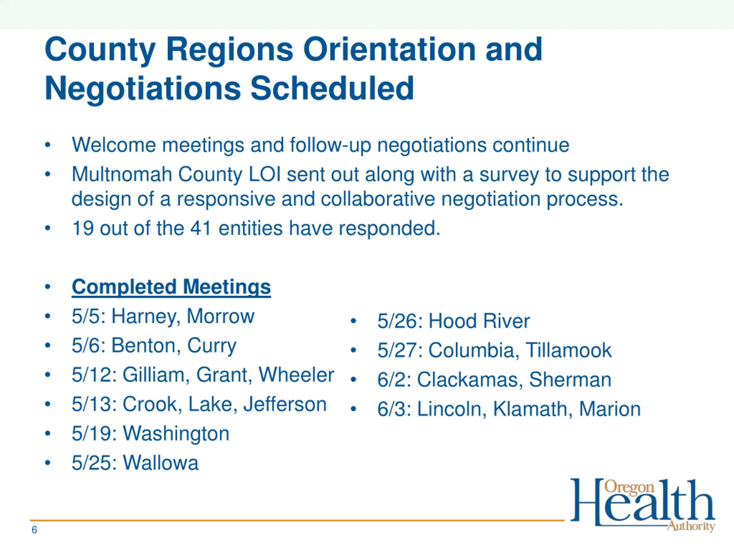 County Regions Orientation and Negotiations Scheduled Welcome meetings and follow-up negotiations continue Multnomah County LOI sent out along with a survey to support the design of a responsive and collaborative negotiation process. 19 out of the 41 entities have responded. Completed Meetings 5/5: Harney, Morrow 5/6: Benton, Curry 5/12: Gilliam, Grant, Wheeler 5/13: Crook, Lake, Jefferson 5/19: Washington 5/25: Wallowa 5/26: Hood River 5/27: Columbia, Tillamook 6/2: Clackamas, Sherman 6/3: Lincoln, Klamath, Marion 6