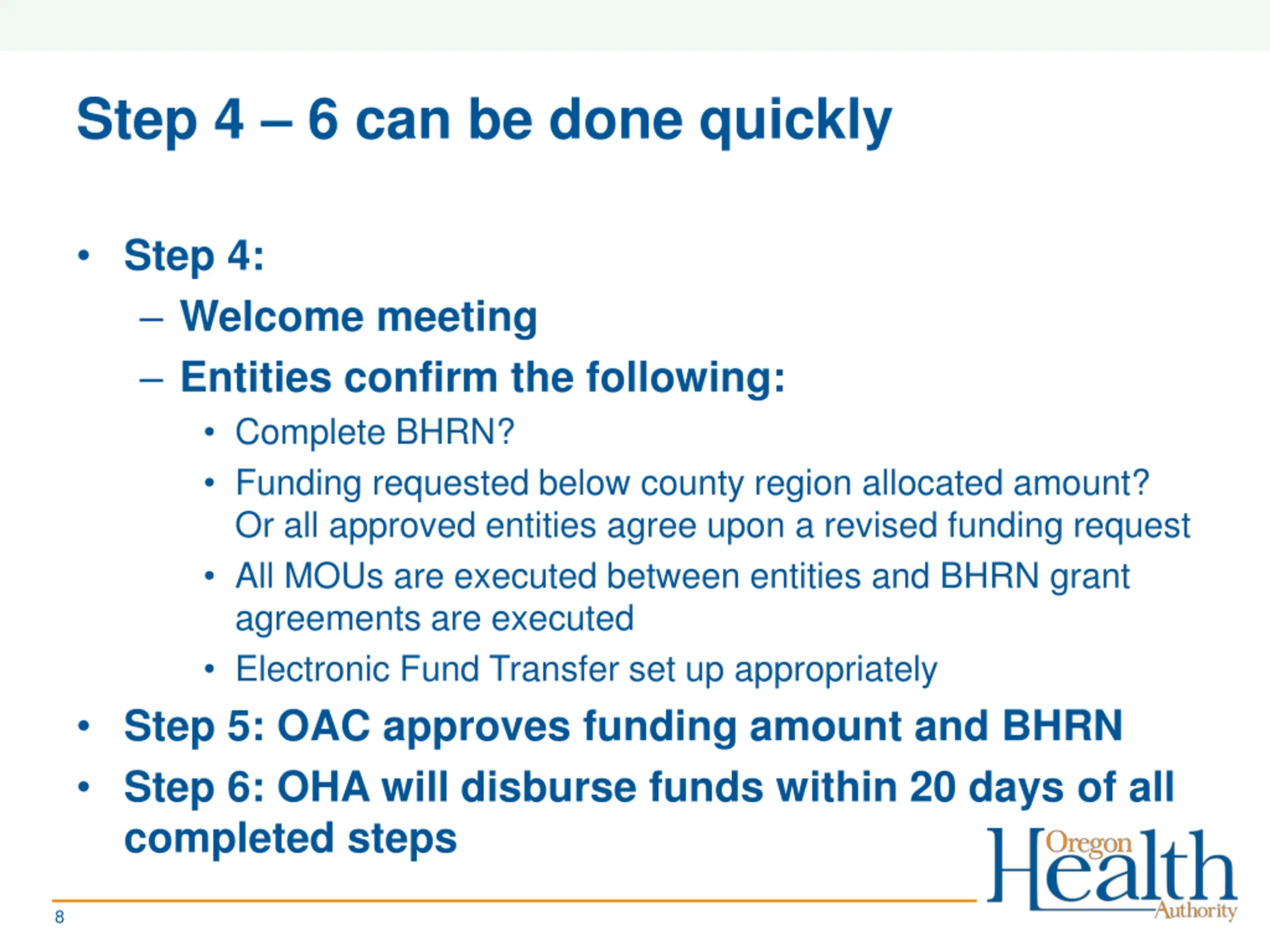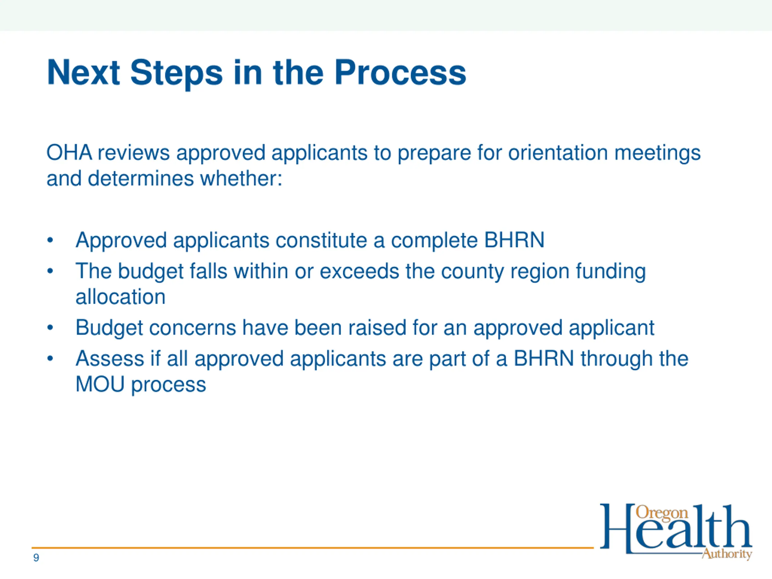 Step 4 6 can be done quickly Step 4: Welcome meeting Entities confirm the following: Complete BHRN? Funding requested below county region allocated amount? Or all approved entities agree upon a revised funding request All MOUs are executed between entities and BHRN grant agreements are executed Electronic Fund Transfer set up appropriately Step 5: OAC approves funding amount and BHRN Step 6: OHA will disburse funds within 20 days of all completed steps 8