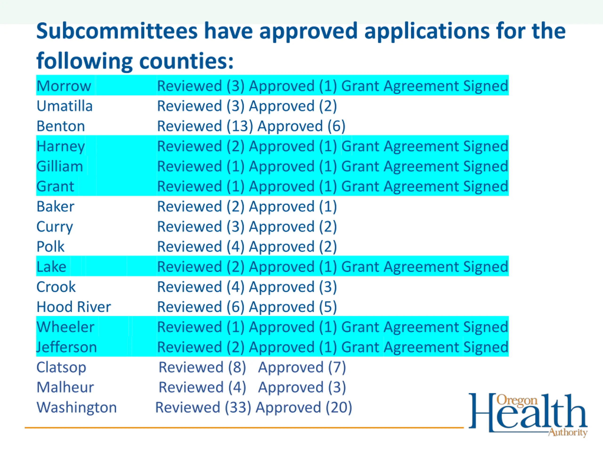 Subcommittees have approved applications for the following counties: Morrow Reviewed (3) Approved (1) Grant Agreement Signed Umatilla Reviewed (3) Approved (2) Benton Reviewed (13) Approved (6) Harney Reviewed (2) Approved (1) Grant Agreement Signed Gilliam Reviewed (1) Approved (1) Grant Agreement Signed Grant Reviewed (1) Approved (1) Grant Agreement Signed Baker Reviewed (2) Approved (1) Curry Reviewed (3) Approved (2) Polk Reviewed (4) Approved (2) Lake Reviewed (2) Approved (1) Grant Agreement Signed Crook Reviewed (4) Approved (3) Hood River Reviewed (6) Approved (5) Wheeler Reviewed (1) Approved (1) Grant Agreement Signed Jefferson Reviewed (2) Approved (1) Grant Agreement Signed Clatsop Reviewed (8) Approved (7) Malheur Reviewed (4) Approved (3) Washington Reviewed (33) Approved (20)