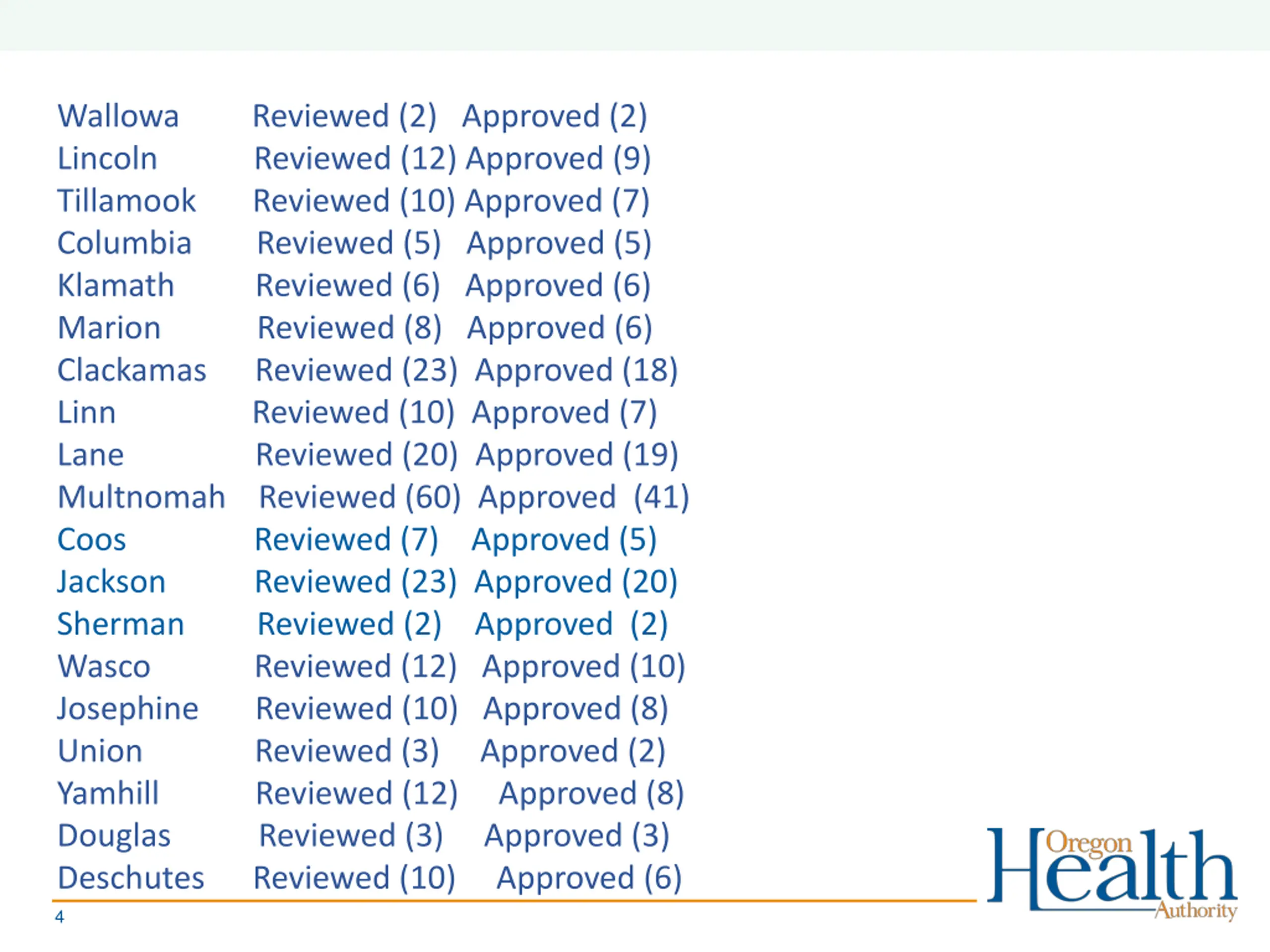 Wallowa Lincoln Tillamook Columbia Klamath Reviewed (6) Approved (6) Marion Reviewed (8) Approved (6) Clackamas Reviewed (23) Approved (18) Linn Reviewed (10) Approved (7) Lane Reviewed (20) Approved (19) Multnomah Reviewed (60) Approved (41) Coos Reviewed (7) Approved (5) Jackson Reviewed (23) Approved (20) Sherman Reviewed (2) Approved (2) Wasco Reviewed (12) Approved (10) Josephine Reviewed (10) Approved (8) Union Reviewed (3) Approved (2) Yamhill Reviewed (12) Approved (8) Douglas Reviewed (3) Approved (3) Deschutes Reviewed (10) Approved (6) Reviewed (2) Approved (2) Reviewed (12) Approved (9) Reviewed (10) Approved (7) Reviewed (5) Approved (5) 4