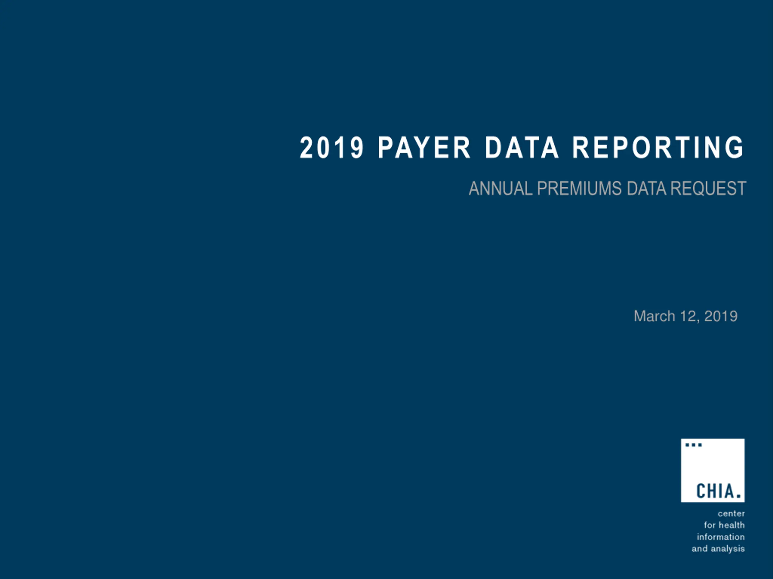 Annual Premiums Data Request Timeline Feb. 2019 Mar. 2019 Apr. 2019 May 2019 Jun. 2019 Jul. 2019 Aug. 2019 Sept. 2019 Payers review draft materials Final 2019 Request released Submissions due Data analysis and reporting 2018 Risk Adjustment data due CHIA s Annual Report