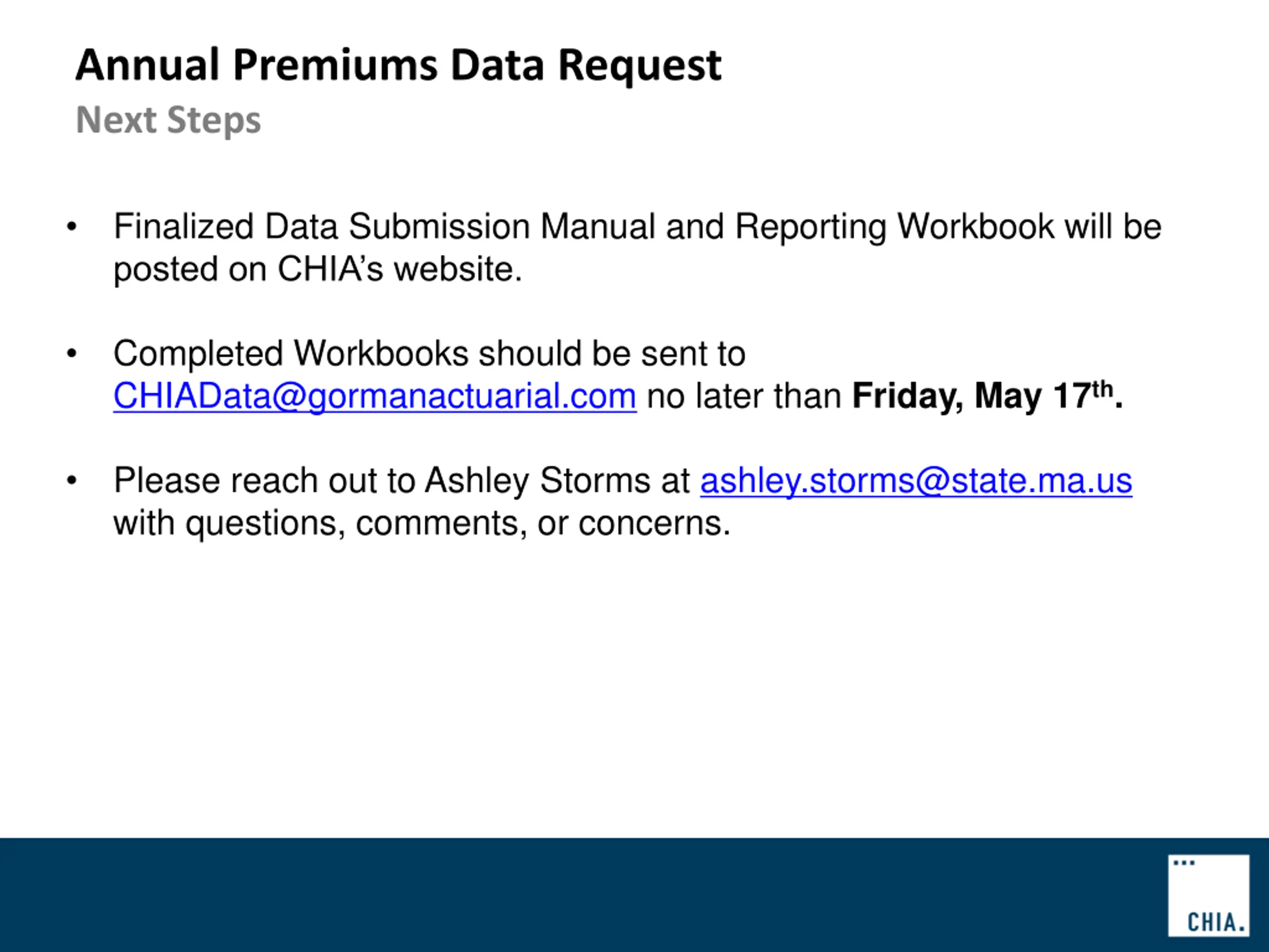 Annual Premiums Data Request Next Steps Finalized Data Submission Manual and Reporting Workbook will be posted on CHIA s website. Completed Workbooks should be sent to CHIAData@gormanactuarial.com no later than Friday, May 17th. Please reach out to Ashley Storms at ashley.storms@state.ma.us with questions, comments, or concerns.