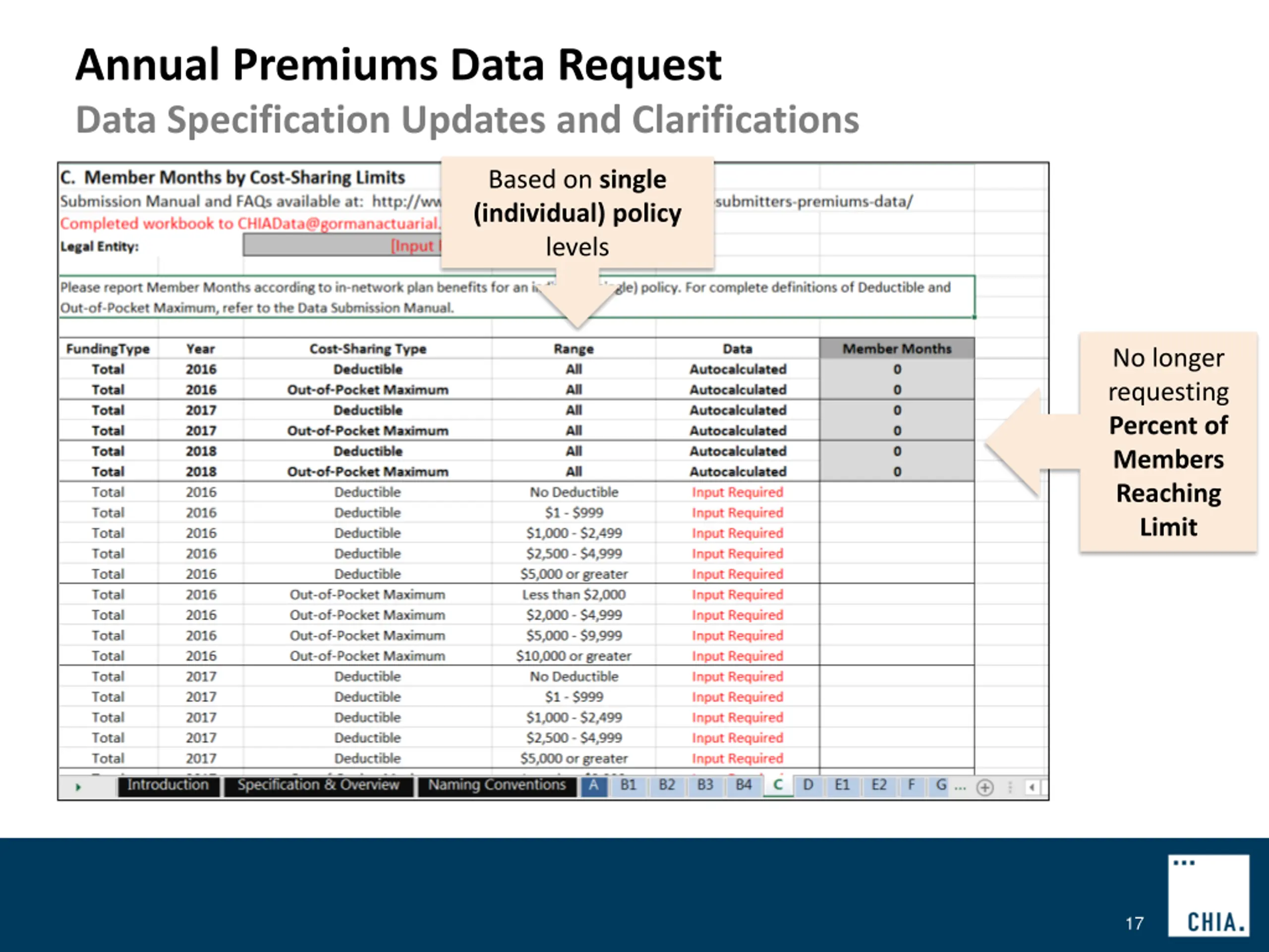 Annual Premiums Data Request Data Specification Updates and Clarifications Tab C (Member Months by Cost-Sharing Limits): Member months should be classified based on the single (individual) policy deductible or out-of-pocket limit, even for members enrolled in family policies CHIA is no longer requesting data on the percent of members reaching their deductible or out-of-pocket limits All member months reported in tabs B1 B4 should also be reported on tab C 16