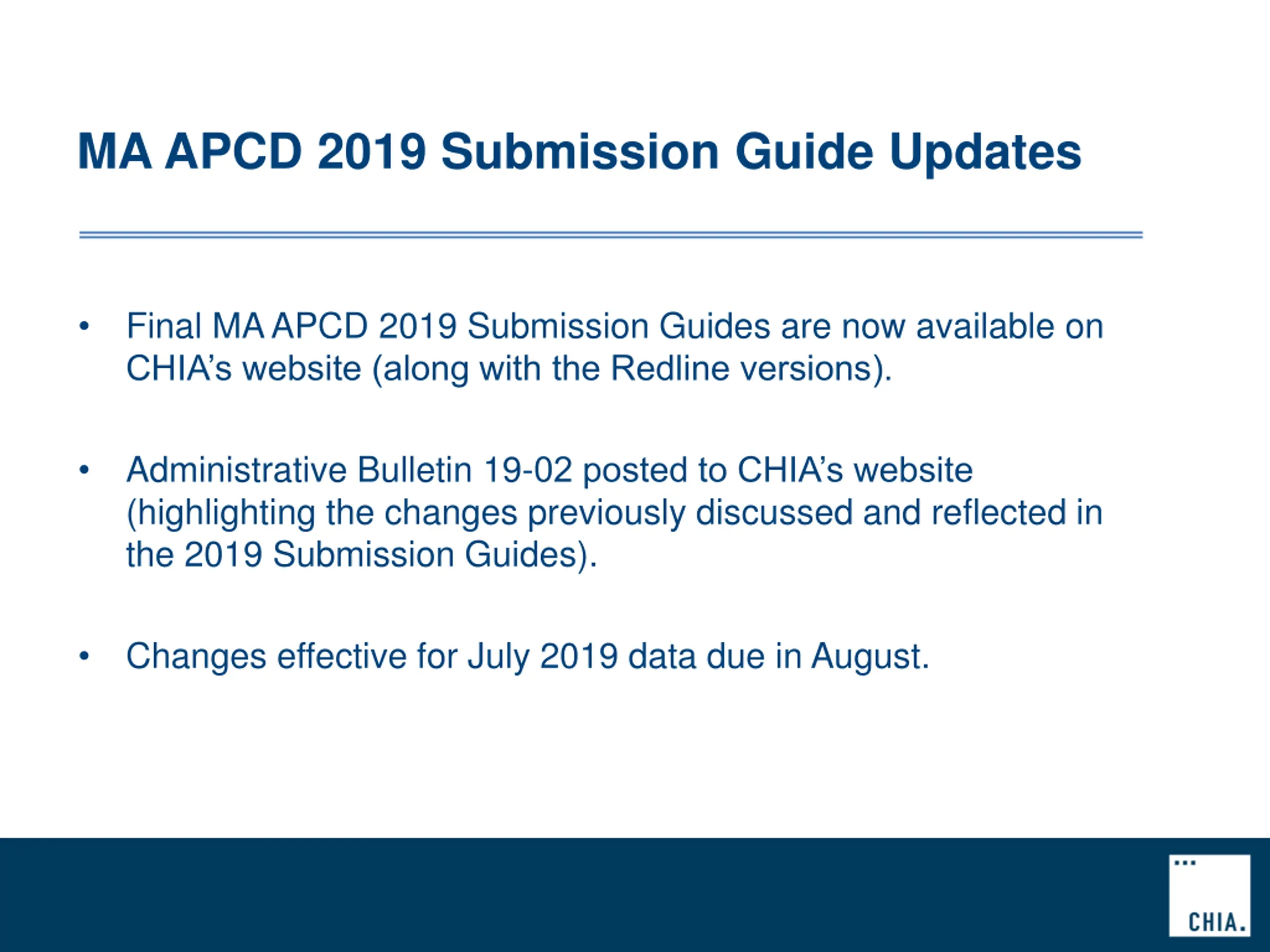 MA APCD 2019 Submission Guide Updates Final MA APCD 2019 Submission Guides are now available on CHIA s website (along with the Redline versions). Administrative Bulletin 19-02 posted to CHIA s website (highlighting the changes previously discussed and reflected in the 2019 Submission Guides). Changes effective for July 2019 data due in August.