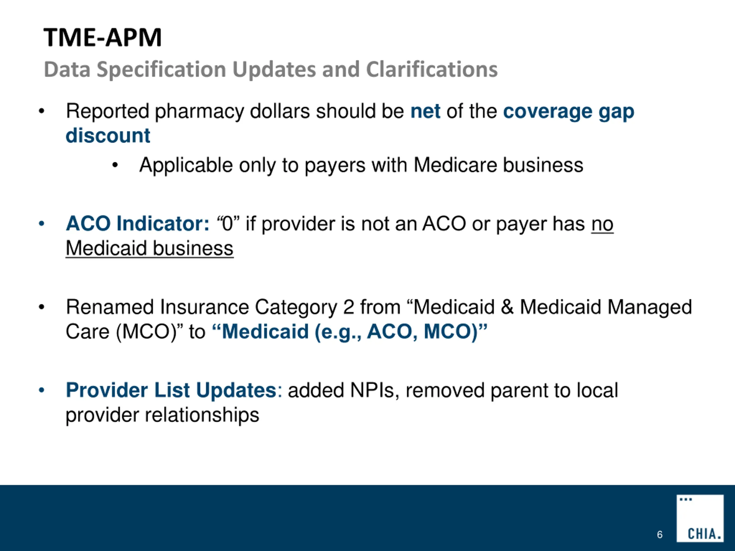 TME-APM Data Specification Updates and Clarifications Reported pharmacy dollars should be net of the coverage gap discount Applicable only to payers with Medicare business ACO Indicator: 0 if provider is not an ACO or payer has no Medicaid business Renamed Insurance Category 2 from Medicaid & Medicaid Managed Care (MCO) to Medicaid (e.g., ACO, MCO) Provider List Updates: added NPIs, removed parent to local provider relationships 6