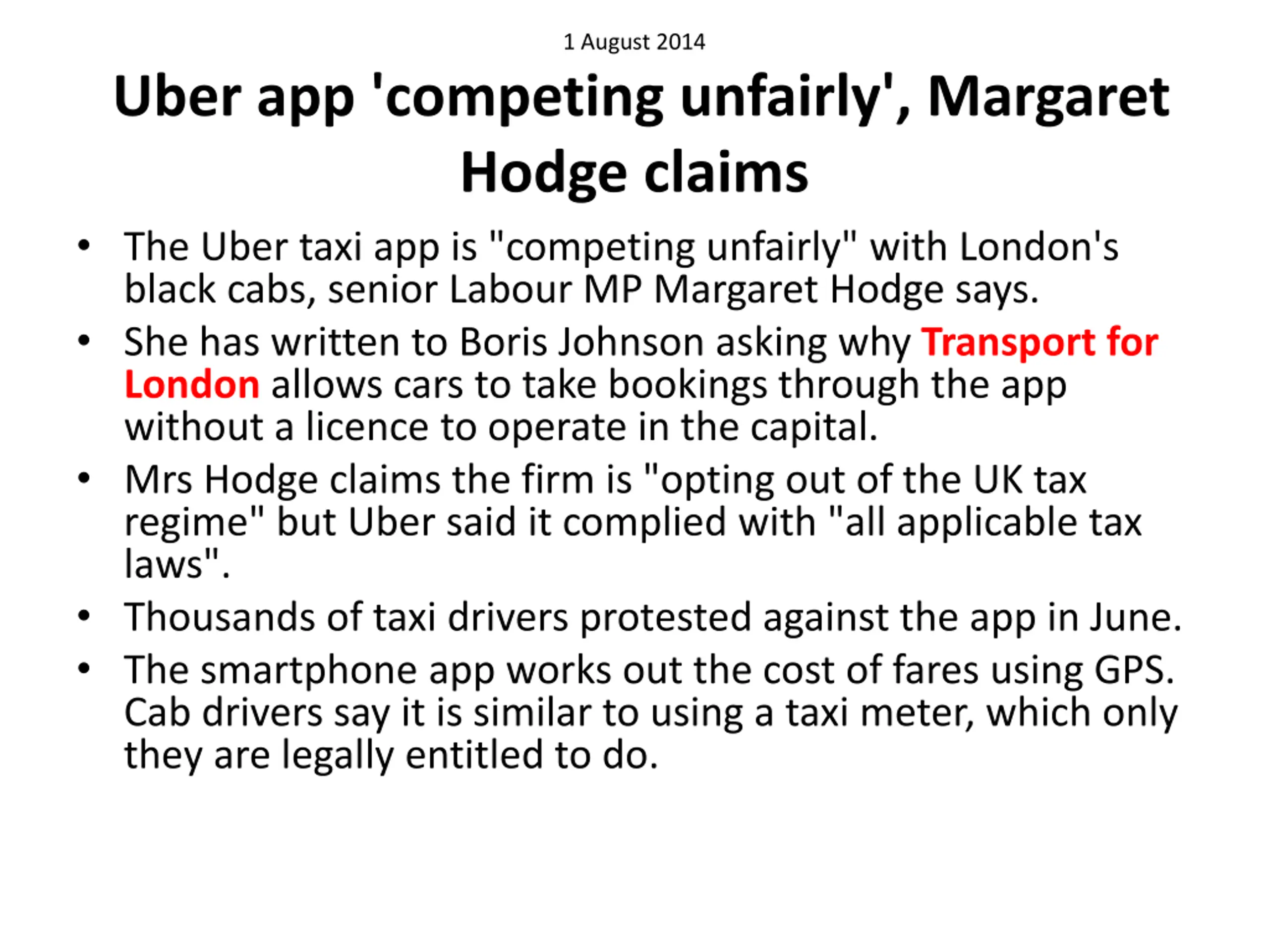 1 August 2014 Uber app 'competing unfairly', Margaret Hodge claims The Uber taxi app is "competing unfairly" with London's black cabs, senior Labour MP Margaret Hodge says. She has written to Boris Johnson asking why Transport for London allows cars to take bookings through the app without a licence to operate in the capital. Mrs Hodge claims the firm is "opting out of the UK tax regime" but Uber said it complied with "all applicable tax laws". Thousands of taxi drivers protested against the app in June. The smartphone app works out the cost of fares using GPS. Cab drivers say it is similar to using a taxi meter, which only they are legally entitled to do.