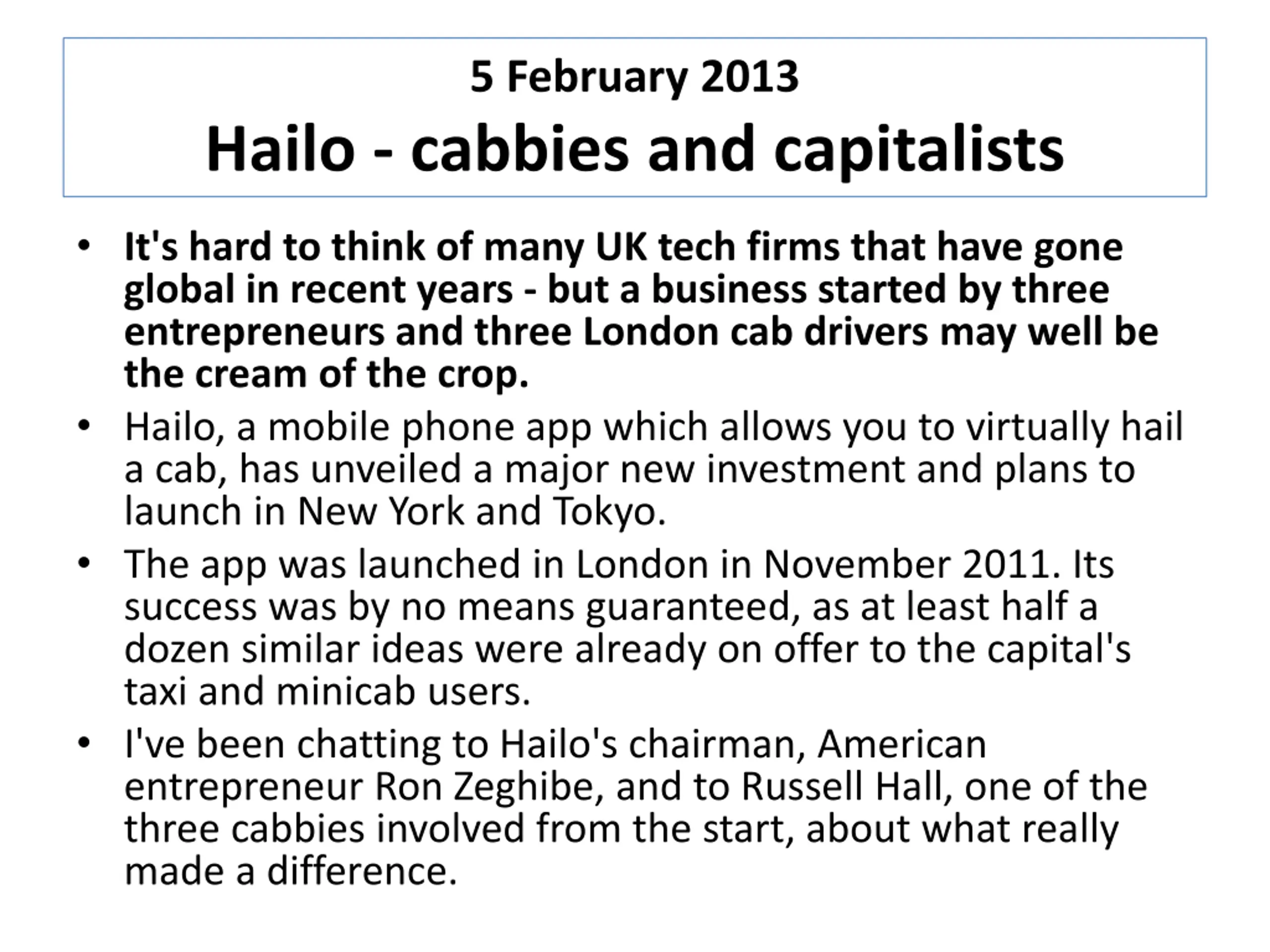 5 February 2013 Hailo - cabbies and capitalists It's hard to think of many UK tech firms that have gone global in recent years - but a business started by three entrepreneurs and three London cab drivers may well be the cream of the crop. Hailo, a mobile phone app which allows you to virtually hail a cab, has unveiled a major new investment and plans to launch in New York and Tokyo. The app was launched in London in November 2011. Its success was by no means guaranteed, as at least half a dozen similar ideas were already on offer to the capital's taxi and minicab users. I've been chatting to Hailo's chairman, American entrepreneur Ron Zeghibe, and to Russell Hall, one of the three cabbies involved from the start, about what really made a difference.