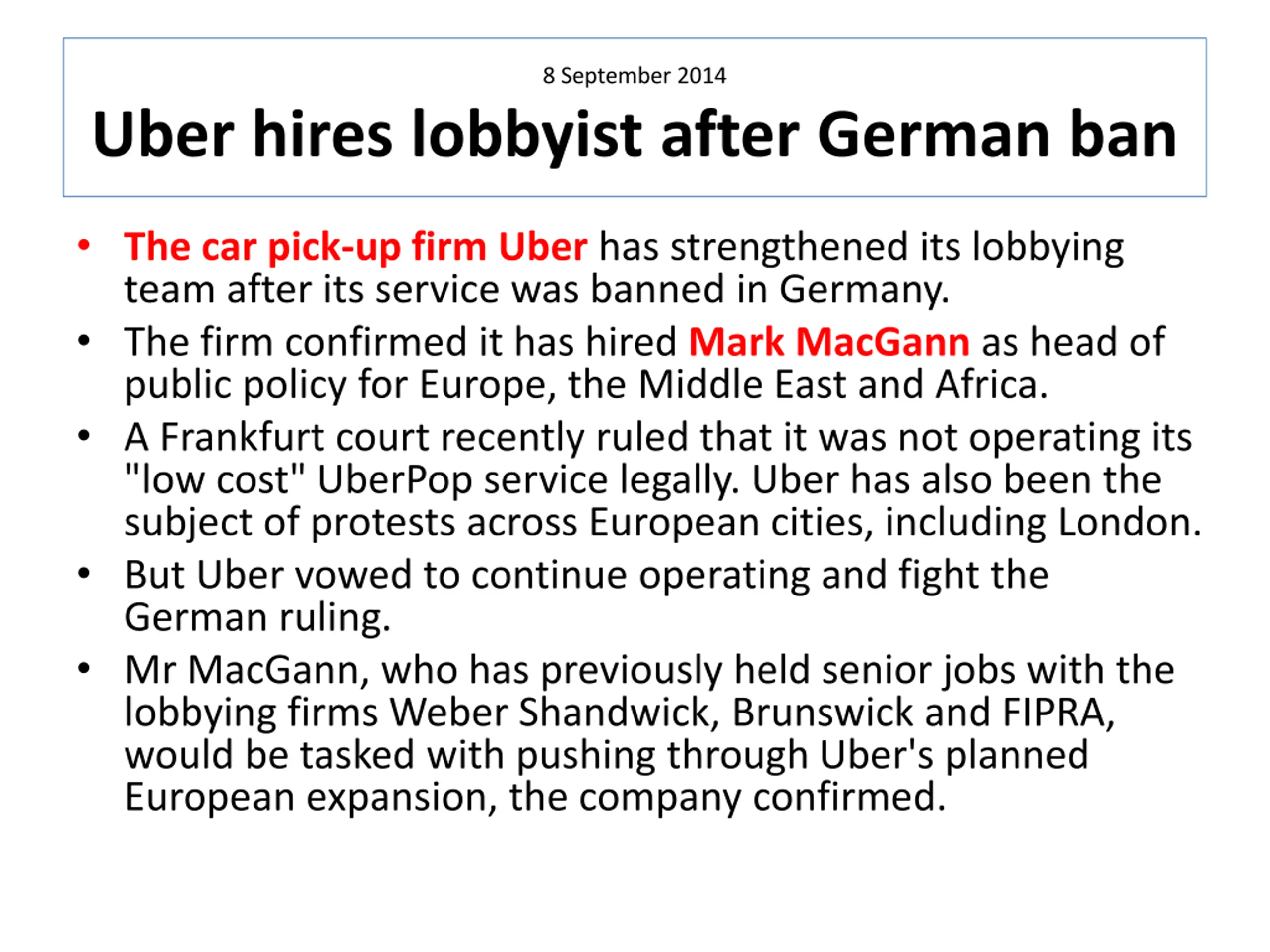 8 September 2014 Uber hires lobbyist after German ban The car pick-up firm Uber has strengthened its lobbying team after its service was banned in Germany. The firm confirmed it has hired Mark MacGann as head of public policy for Europe, the Middle East and Africa. A Frankfurt court recently ruled that it was not operating its "low cost" UberPop service legally. Uber has also been the subject of protests across European cities, including London. But Uber vowed to continue operating and fight the German ruling. Mr MacGann, who has previously held senior jobs with the lobbying firms Weber Shandwick, Brunswick and FIPRA, would be tasked with pushing through Uber's planned European expansion, the company confirmed.