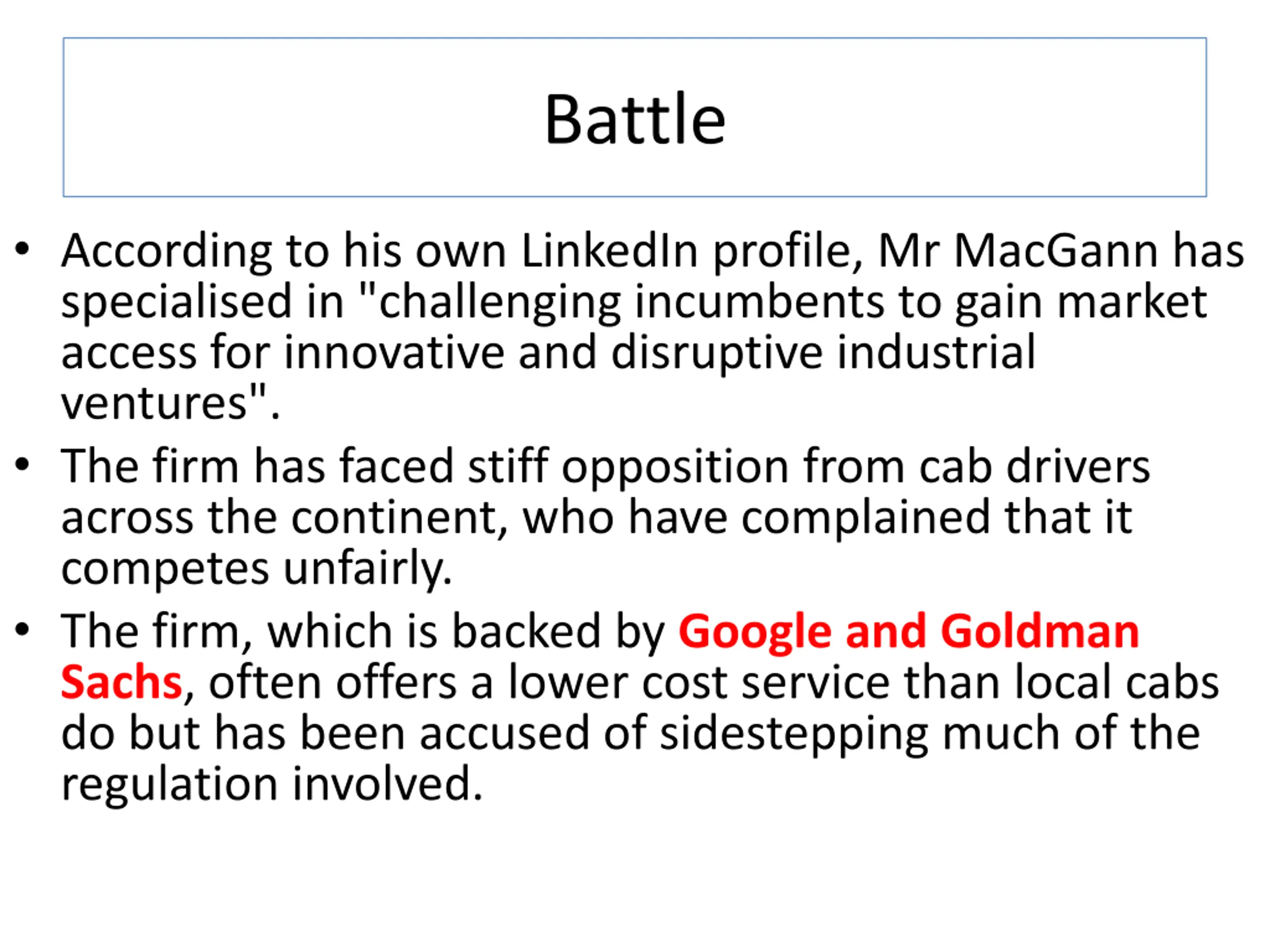 Battle According to his own LinkedIn profile, Mr MacGann has specialised in "challenging incumbents to gain market access for innovative and disruptive industrial ventures". The firm has faced stiff opposition from cab drivers across the continent, who have complained that it competes unfairly. The firm, which is backed by Google and Goldman Sachs, often offers a lower cost service than local cabs do but has been accused of sidestepping much of the regulation involved.