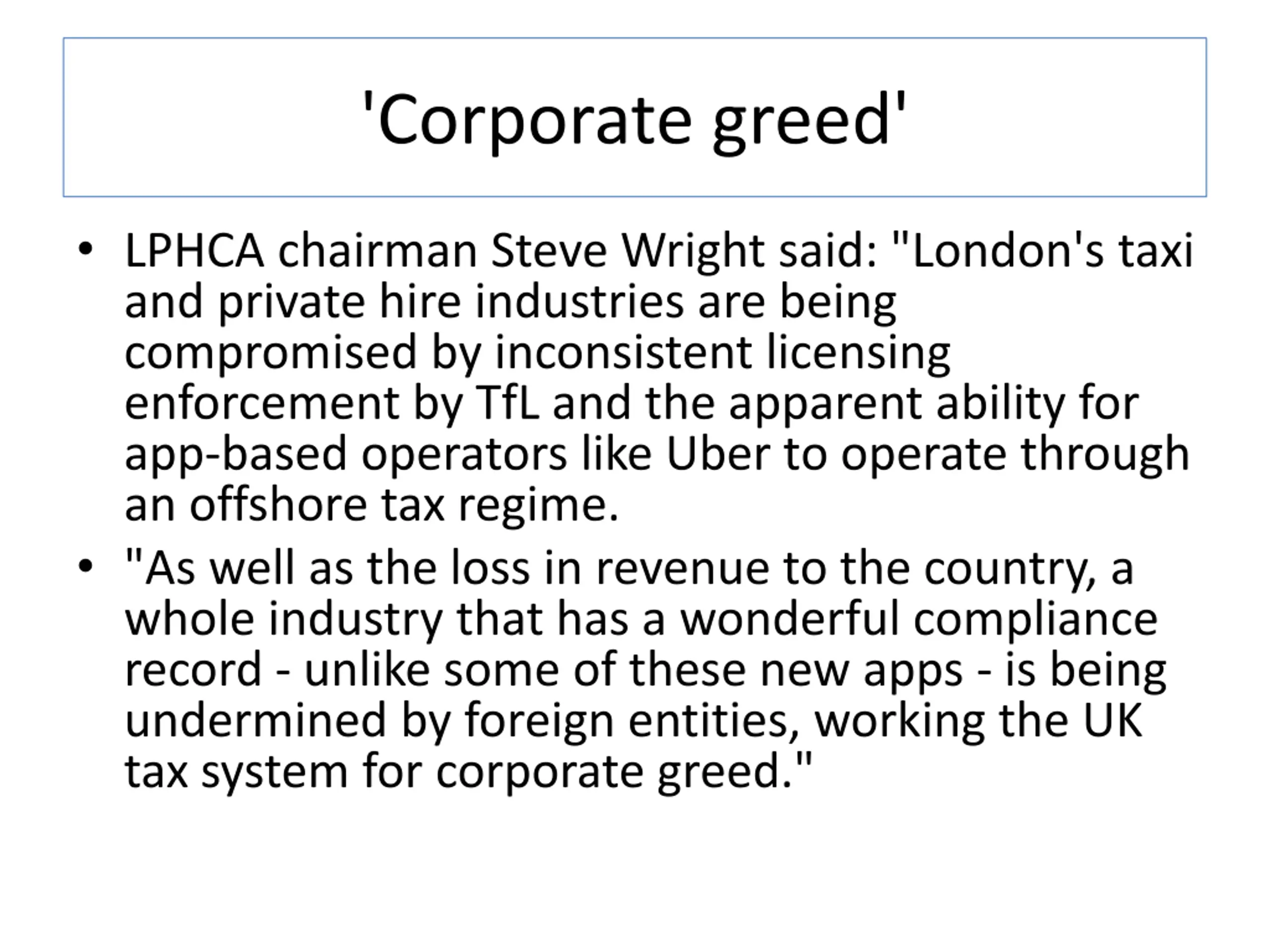 'Corporate greed' LPHCA chairman Steve Wright said: "London's taxi and private hire industries are being compromised by inconsistent licensing enforcement by TfL and the apparent ability for app-based operators like Uber to operate through an offshore tax regime. "As well as the loss in revenue to the country, a whole industry that has a wonderful compliance record - unlike some of these new apps - is being undermined by foreign entities, working the UK tax system for corporate greed."