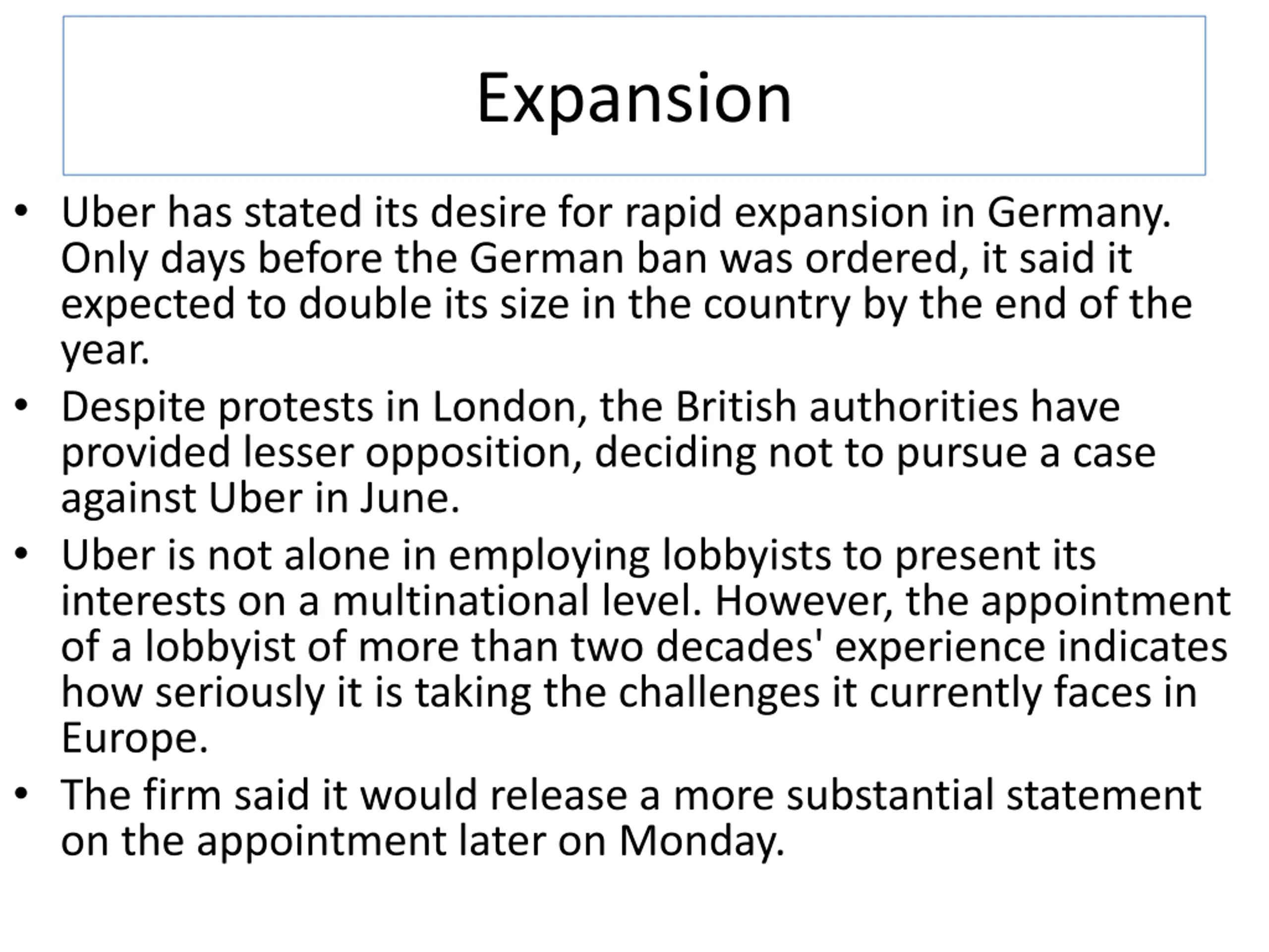 Expansion Uber has stated its desire for rapid expansion in Germany. Only days before the German ban was ordered, it said it expected to double its size in the country by the end of the year. Despite protests in London, the British authorities have provided lesser opposition, deciding not to pursue a case against Uber in June. Uber is not alone in employing lobbyists to present its interests on a multinational level. However, the appointment of a lobbyist of more than two decades' experience indicates how seriously it is taking the challenges it currently faces in Europe. The firm said it would release a more substantial statement on the appointment later on Monday.