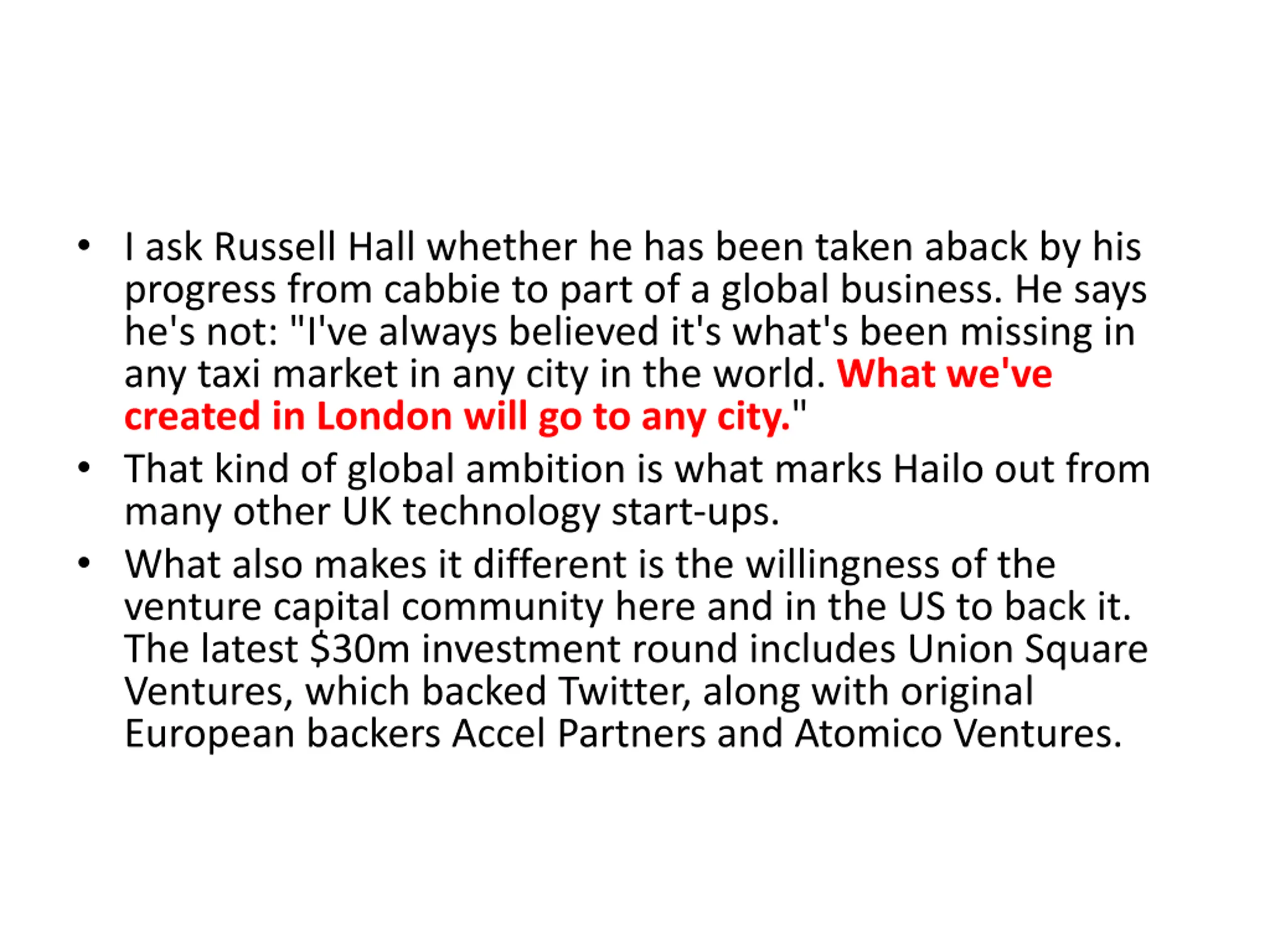 I ask Russell Hall whether he has been taken aback by his progress from cabbie to part of a global business. He says he's not: "I've always believed it's what's been missing in any taxi market in any city in the world. What we've created in London will go to any city." That kind of global ambition is what marks Hailo out from many other UK technology start-ups. What also makes it different is the willingness of the venture capital community here and in the US to back it. The latest $30m investment round includes Union Square Ventures, which backed Twitter, along with original European backers Accel Partners and Atomico Ventures.