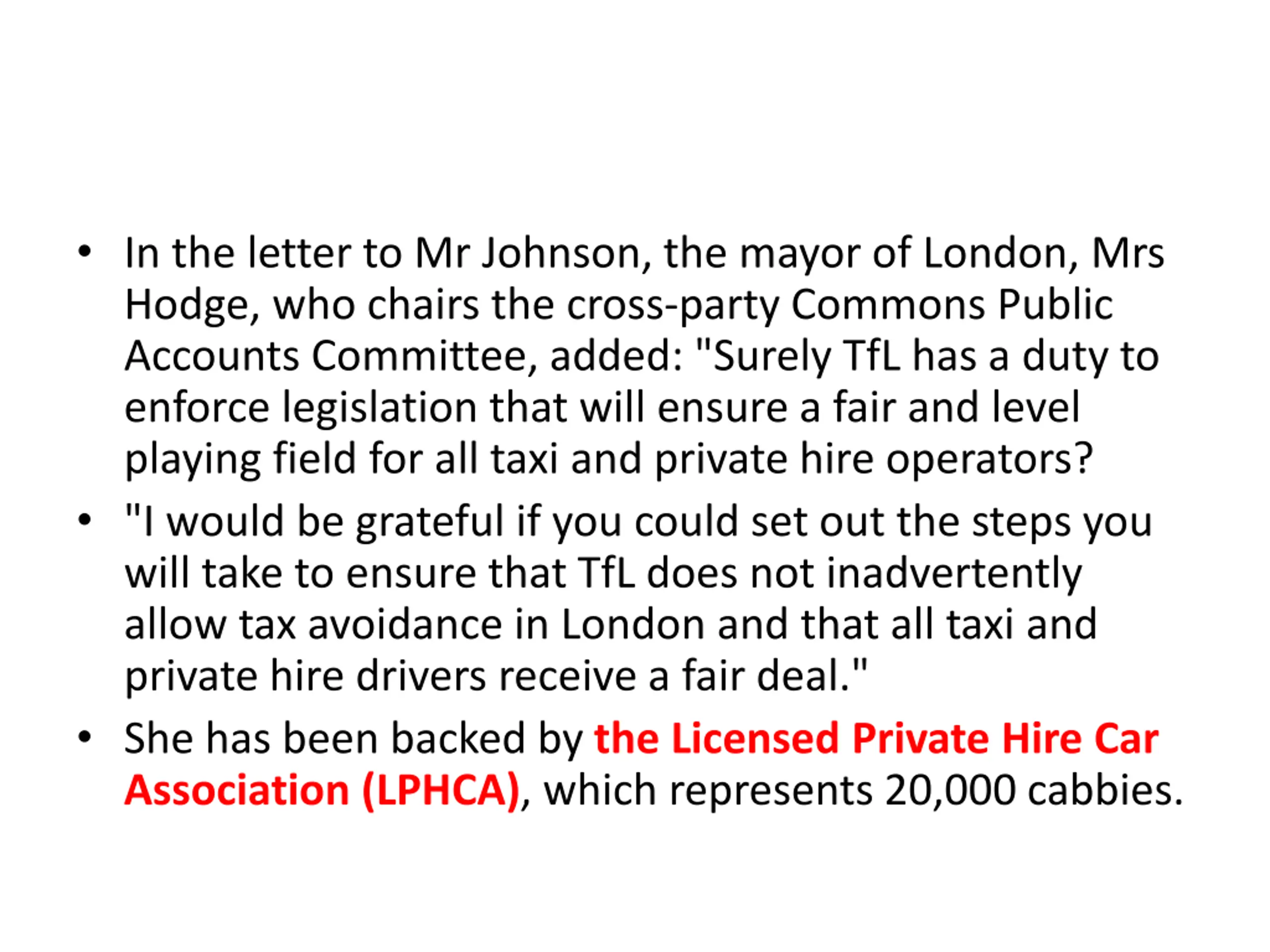 In the letter to Mr Johnson, the mayor of London, Mrs Hodge, who chairs the cross-party Commons Public Accounts Committee, added: "Surely TfL has a duty to enforce legislation that will ensure a fair and level playing field for all taxi and private hire operators? "I would be grateful if you could set out the steps you will take to ensure that TfL does not inadvertently allow tax avoidance in London and that all taxi and private hire drivers receive a fair deal." She has been backed by the Licensed Private Hire Car Association (LPHCA), which represents 20,000 cabbies.