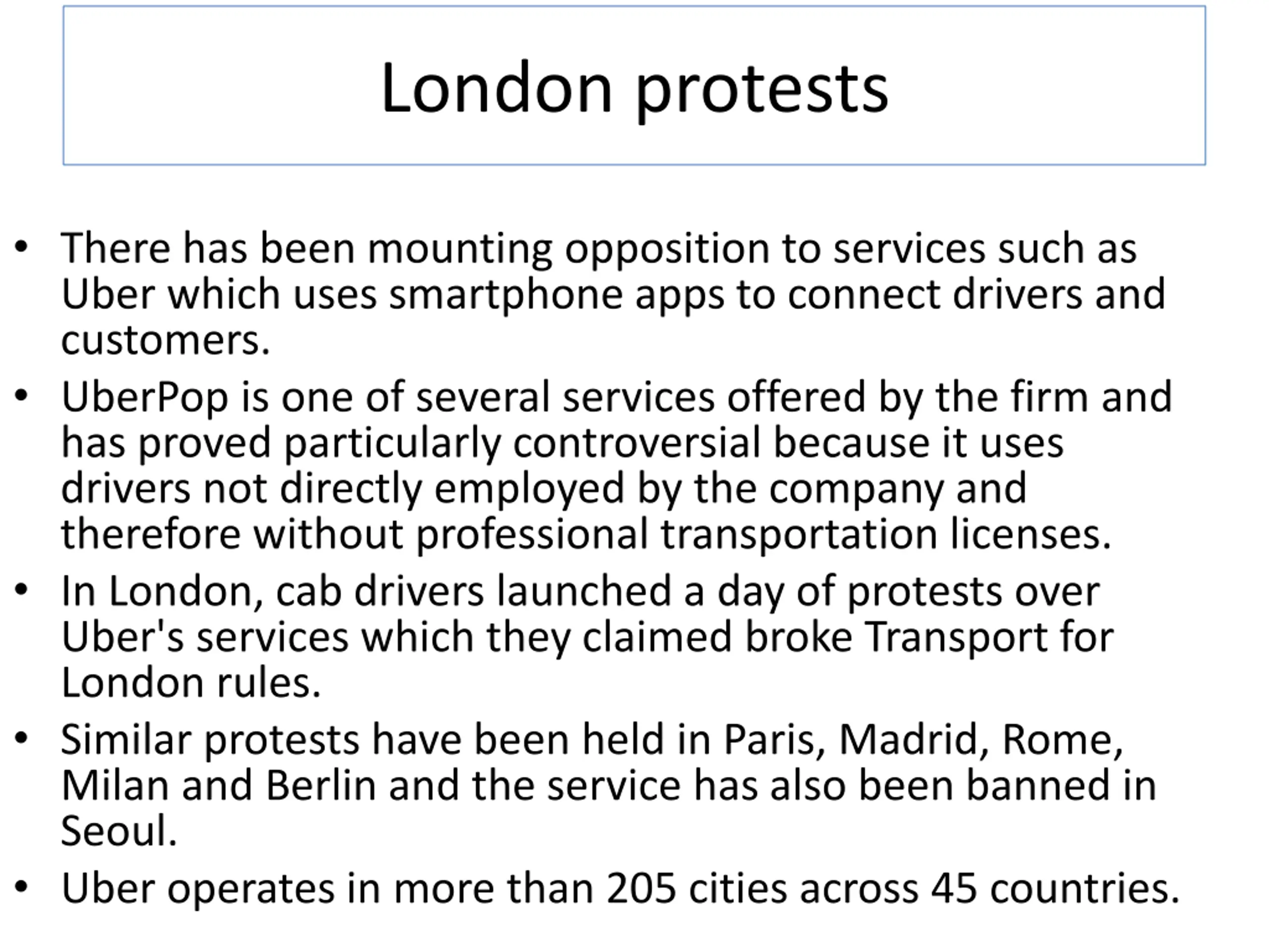 London protests There has been mounting opposition to services such as Uber which uses smartphone apps to connect drivers and customers. UberPop is one of several services offered by the firm and has proved particularly controversial because it uses drivers not directly employed by the company and therefore without professional transportation licenses. In London, cab drivers launched a day of protests over Uber's services which they claimed broke Transport for London rules. Similar protests have been held in Paris, Madrid, Rome, Milan and Berlin and the service has also been banned in Seoul. Uber operates in more than 205 cities across 45 countries.