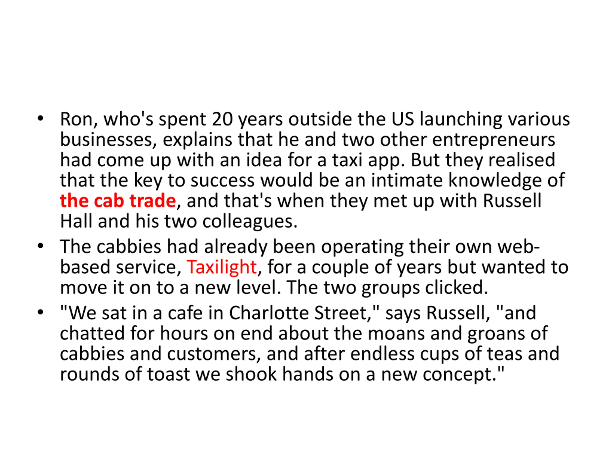 Ron, who's spent 20 years outside the US launching various businesses, explains that he and two other entrepreneurs had come up with an idea for a taxi app. But they realised that the key to success would be an intimate knowledge of the cab trade, and that's when they met up with Russell Hall and his two colleagues. The cabbies had already been operating their own web- based service, Taxilight, for a couple of years but wanted to move it on to a new level. The two groups clicked. "We sat in a cafe in Charlotte Street," says Russell, "and chatted for hours on end about the moans and groans of cabbies and customers, and after endless cups of teas and rounds of toast we shook hands on a new concept."