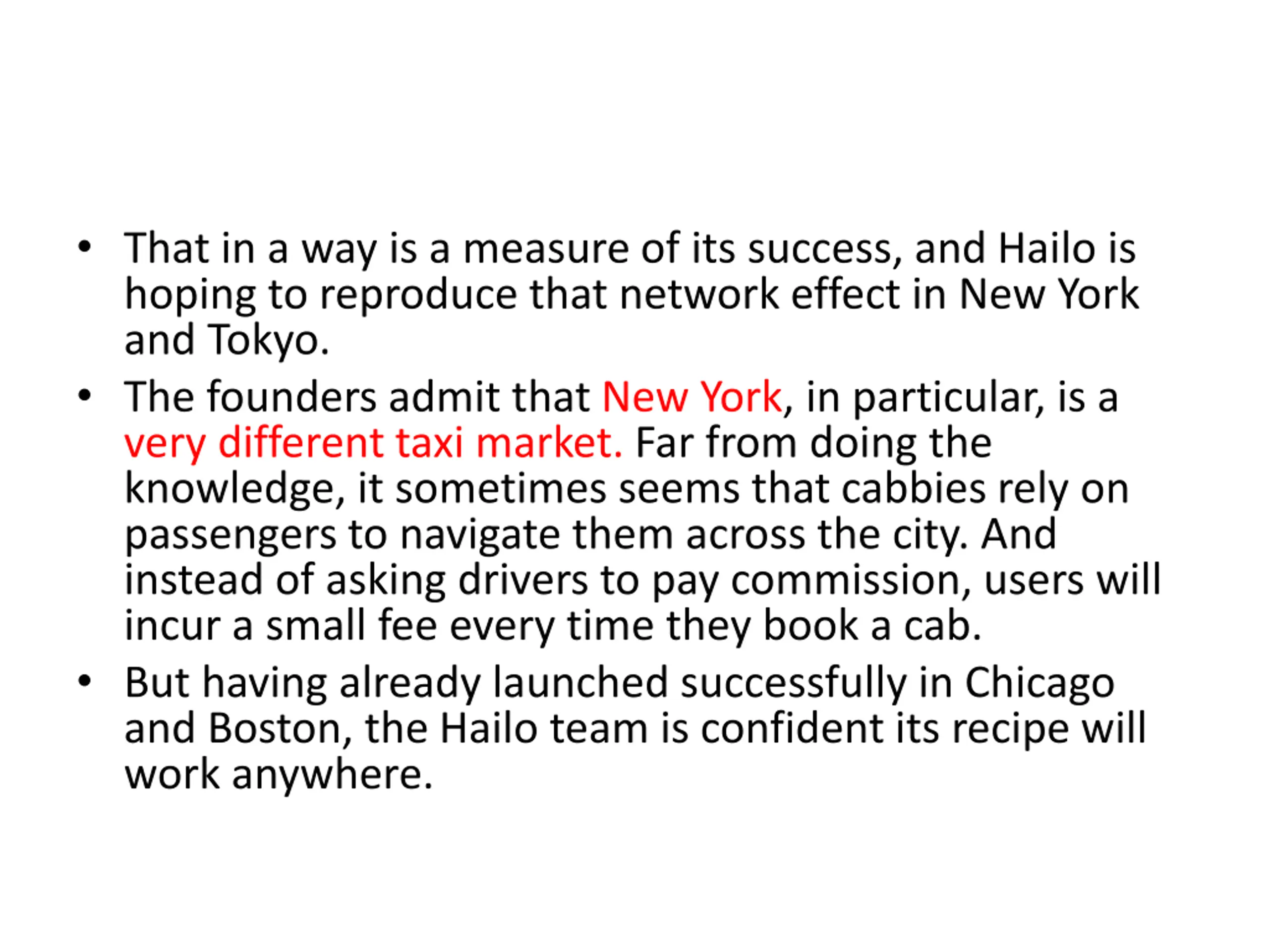 That in a way is a measure of its success, and Hailo is hoping to reproduce that network effect in New York and Tokyo. The founders admit that New York, in particular, is a very different taxi market. Far from doing the knowledge, it sometimes seems that cabbies rely on passengers to navigate them across the city. And instead of asking drivers to pay commission, users will incur a small fee every time they book a cab. But having already launched successfully in Chicago and Boston, the Hailo team is confident its recipe will work anywhere.