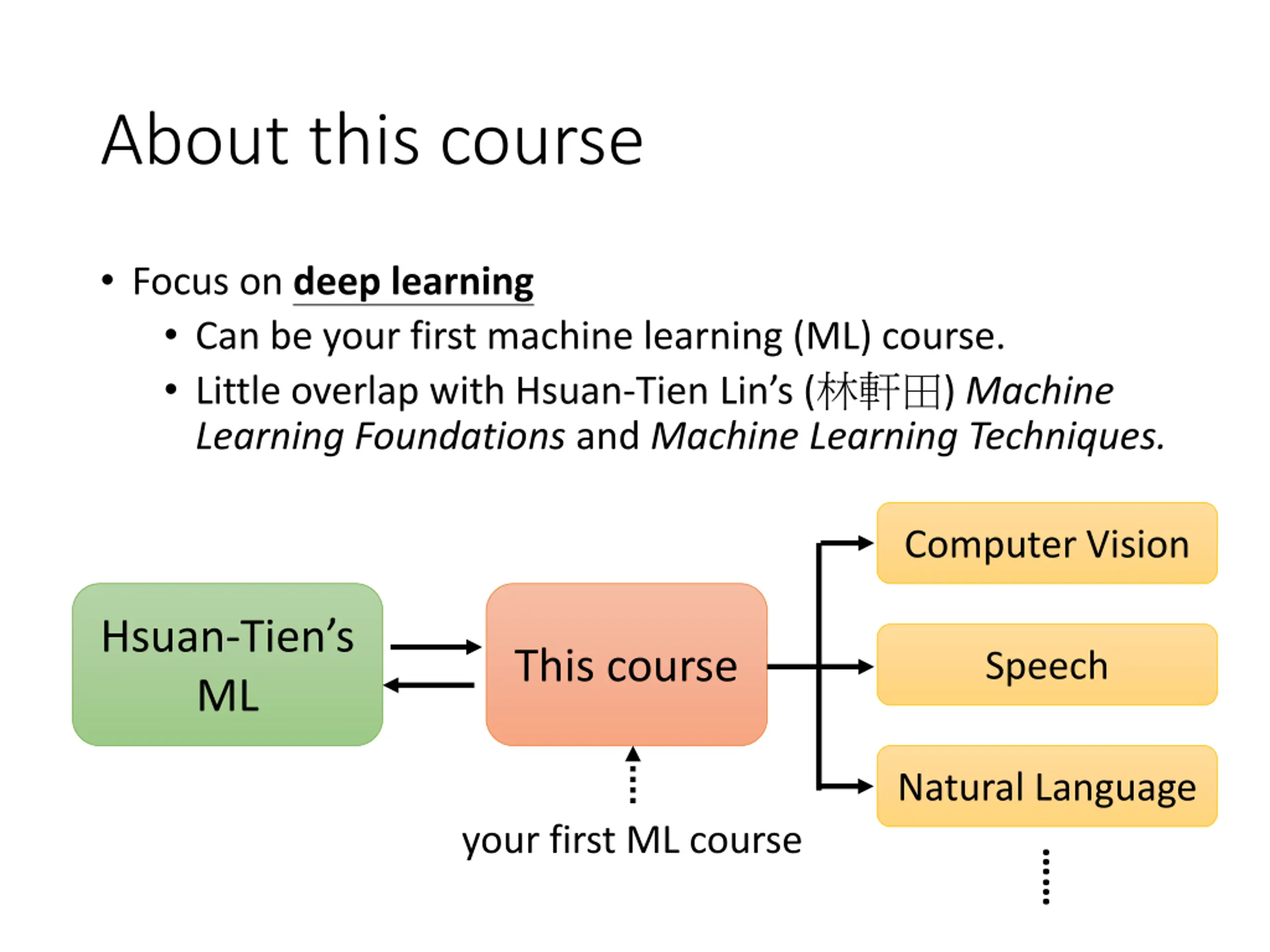 About this course Focus on deep learning Can be your first machine learning (ML) course. Little overlap with Hsuan-Tien Lin s ( ) Machine Learning Foundations and Machine Learning Techniques. Computer Vision Hsuan-Tien s ML This course Speech Natural Language your first ML course