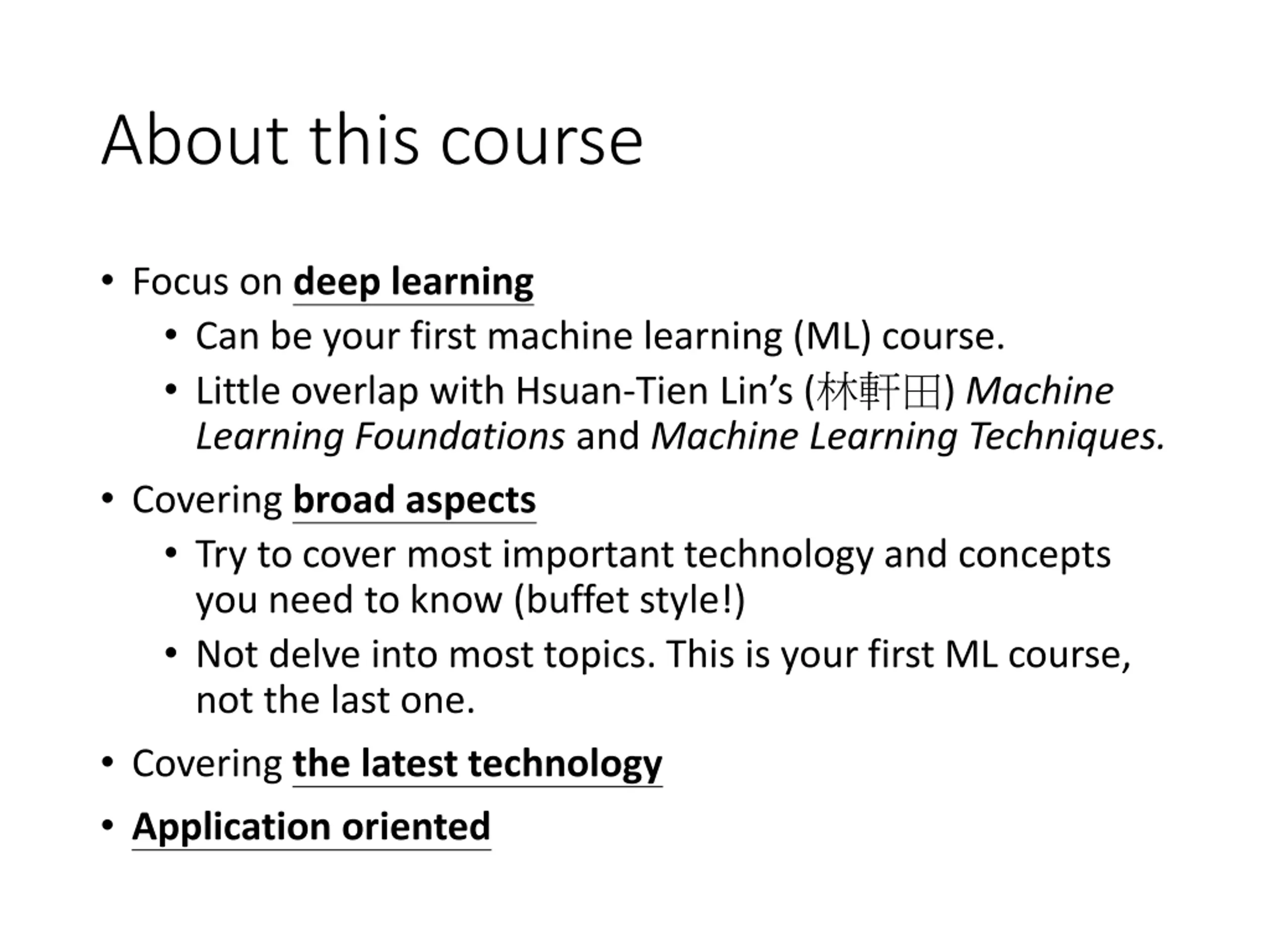 About this course Focus on deep learning Can be your first machine learning (ML) course. Little overlap with Hsuan-Tien Lin s ( ) Machine Learning Foundations and Machine Learning Techniques. Covering broad aspects Try to cover most important technology and concepts you need to know (buffet style!) Not delve into most topics. This is your first ML course, not the last one. Covering the latest technology Application oriented