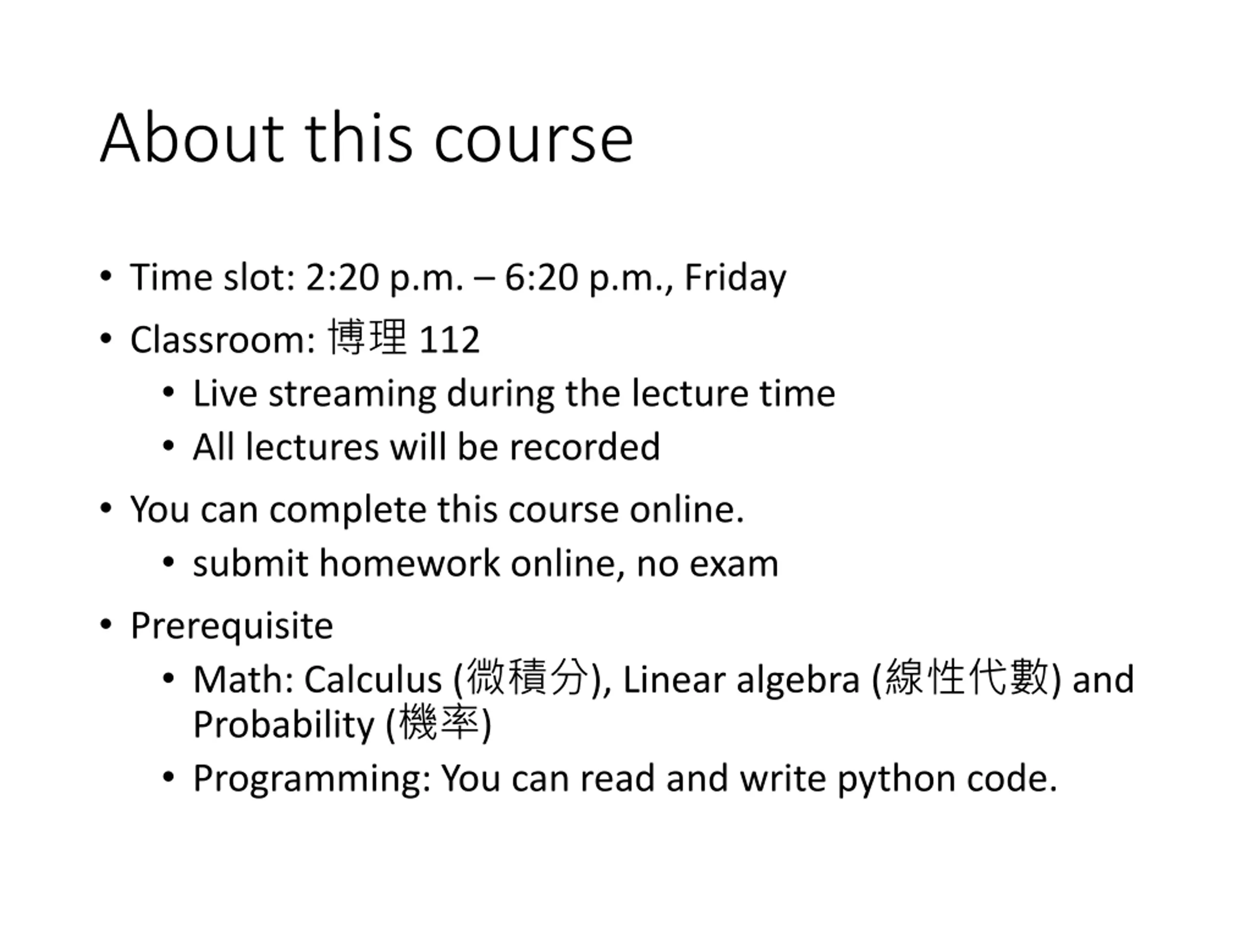 About this course Time slot: 2:20 p.m. 6:20 p.m., Friday Classroom: 112 Live streaming during the lecture time All lectures will be recorded You can complete this course online. submit homework online, no exam Prerequisite Math: Calculus ( ), Linear algebra ( ) and Probability ( ) Programming: You can read and write python code.