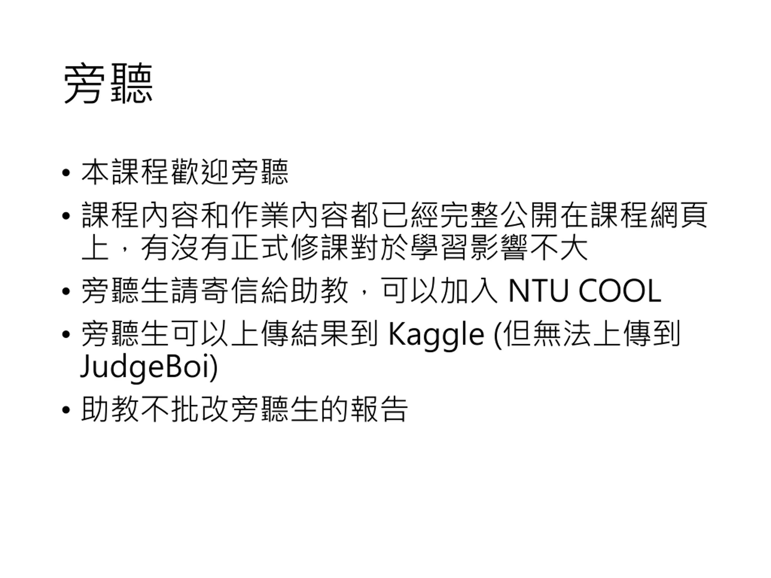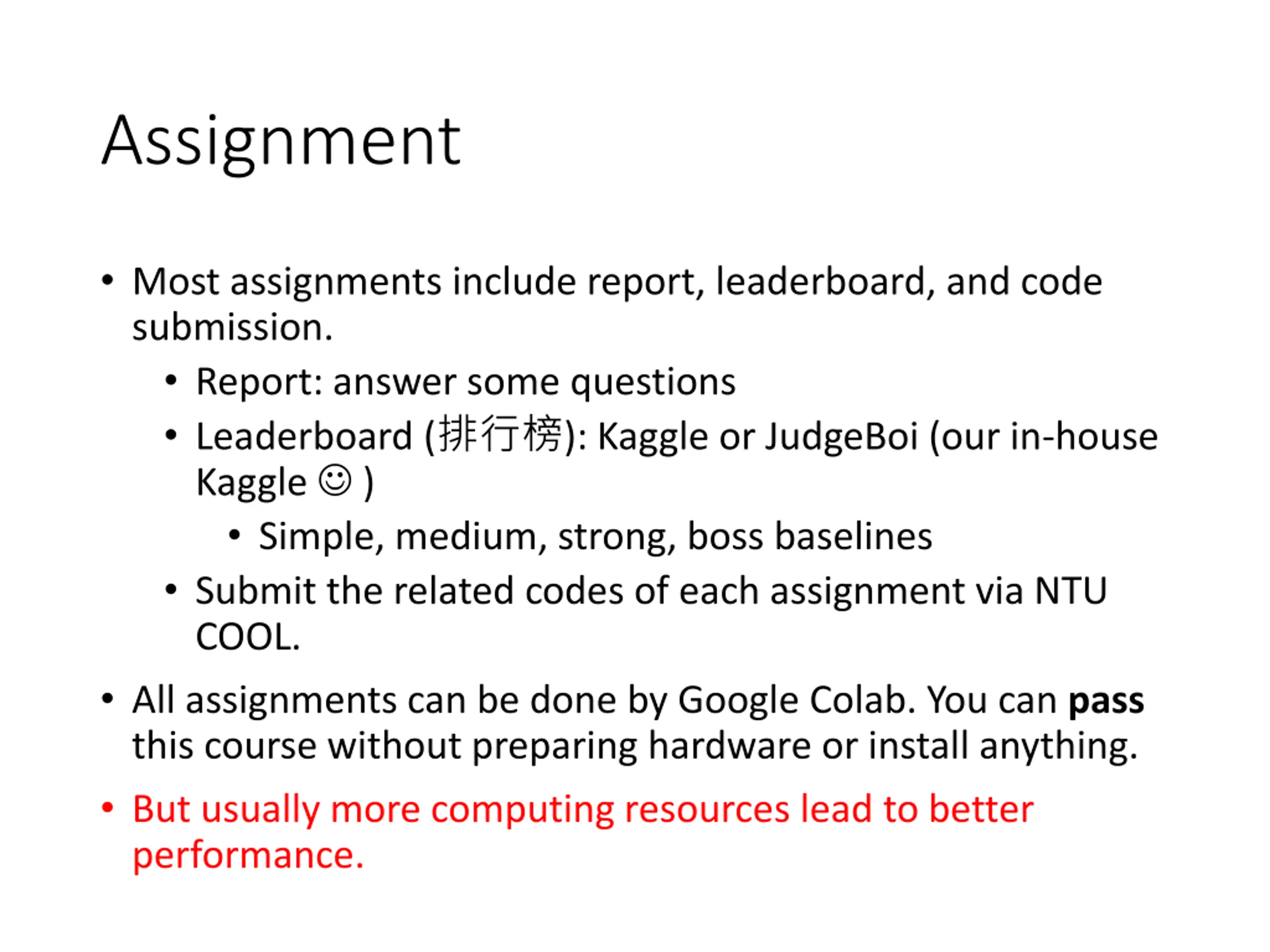Assignment Most assignments include report, leaderboard, and code submission. Report: answer some questions Leaderboard ( ): Kaggle or JudgeBoi (our in-house Kaggle ) Simple, medium, strong, boss baselines Submit the related codes of each assignment via NTU COOL. All assignments can be done by Google Colab. You can pass this course without preparing hardware or install anything. But usually more computing resources lead to better performance.