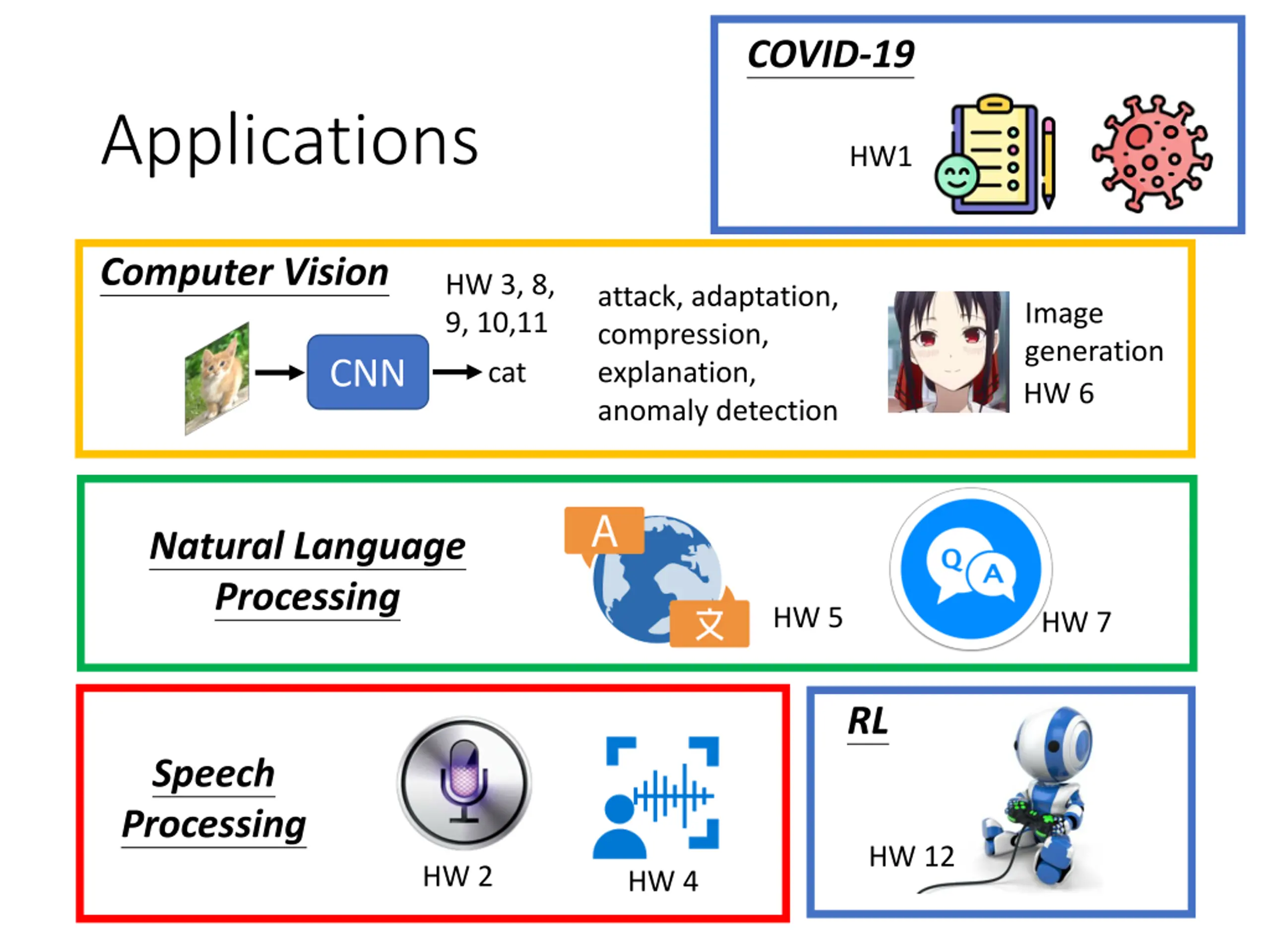 COVID-19 Applications HW1 Computer Vision HW 3, 8, 9, 10,11 attack, adaptation, compression, explanation, anomaly detection Image generation HW 6 CNN cat Natural Language Processing HW 5 HW 7 RL Speech Processing HW 12 HW 2 HW 4