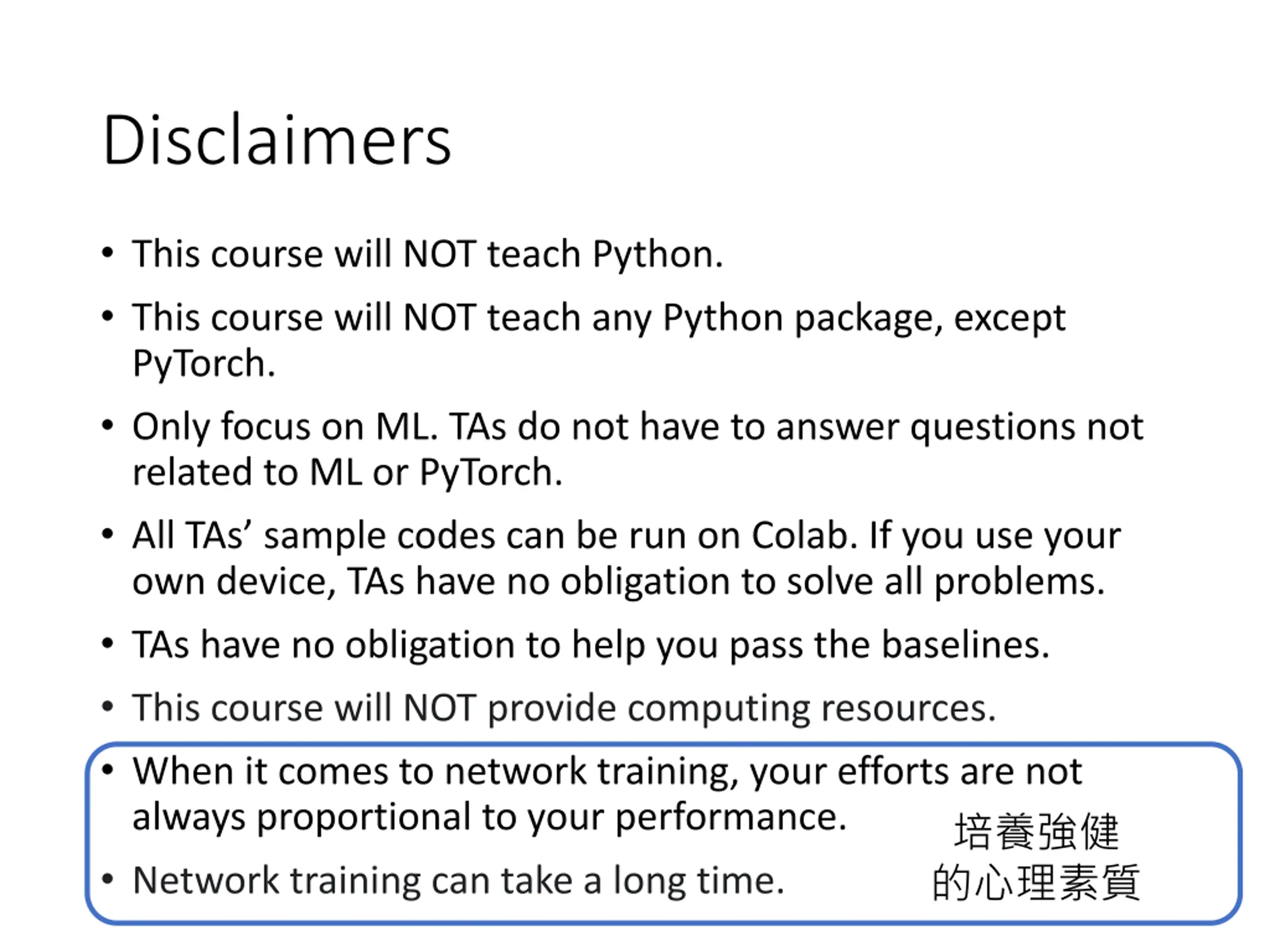 Disclaimers This course will NOT teach Python. This course will NOT teach any Python package, except PyTorch. Only focus on ML. TAs do not have to answer questions not related to ML or PyTorch. All TAs sample codes can be run on Colab. If you use your own device, TAs have no obligation to solve all problems. TAs have no obligation to help you pass the baselines. This course will NOT provide computing resources. When it comes to network training, your efforts are not always proportional to your performance. Network training can take a long time.